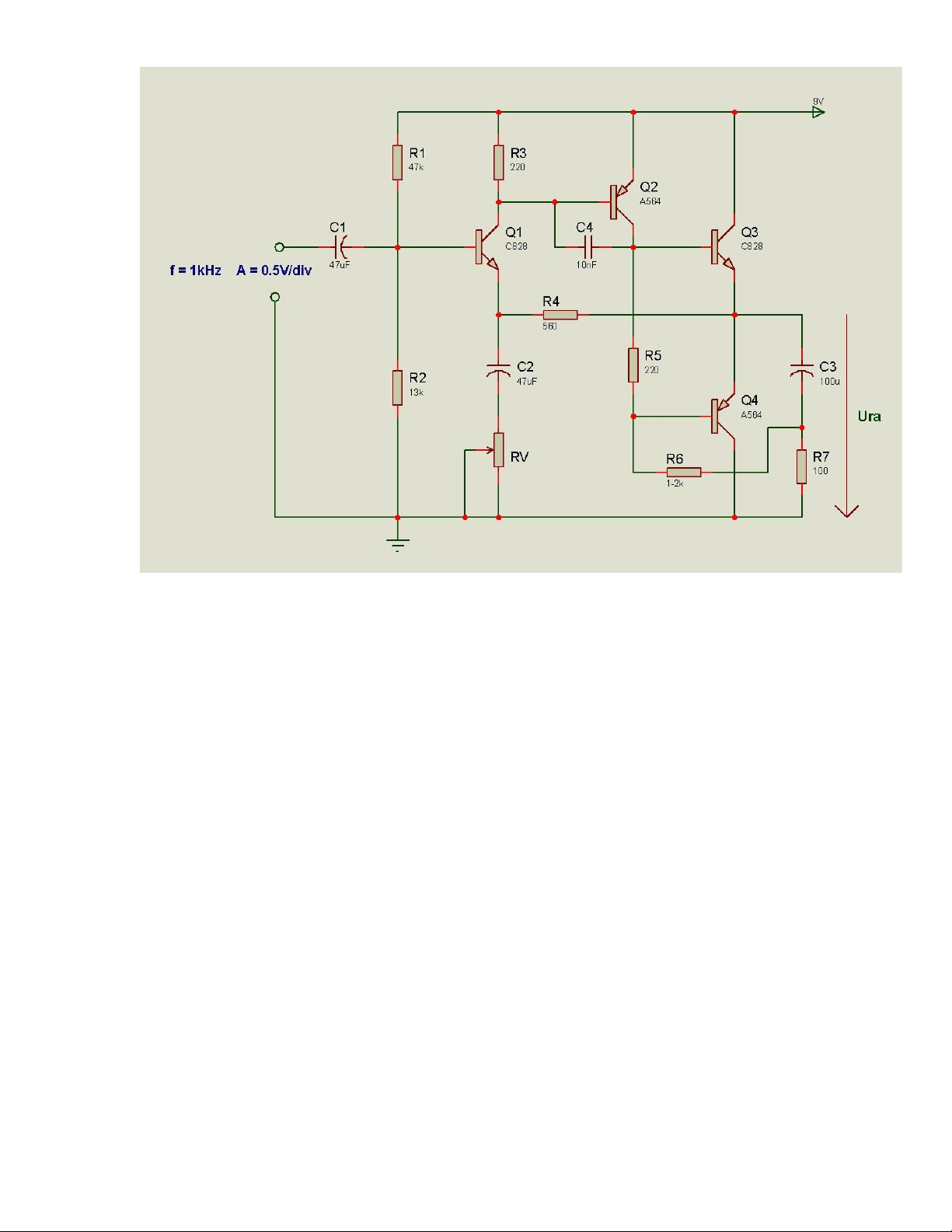 Sau đó tín hiệu được lấy ra ở cực C của Q2 và chia làm hai đường: 1 đường vào Bazơ của đèn Q4. Tín hiệu ra được ghép với nhau tại
