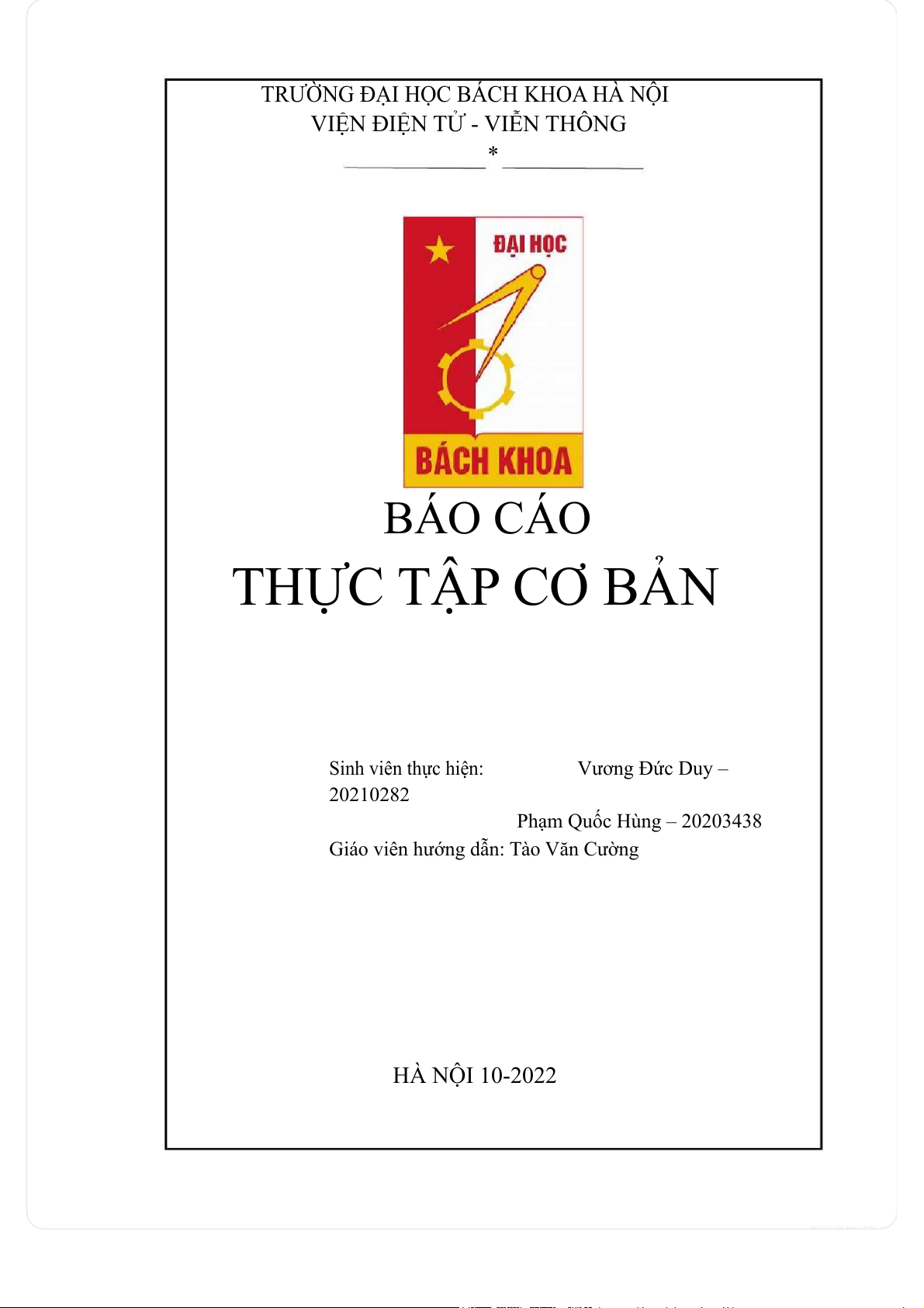 VIỆN ĐIỆN TỬ - VIỄN THÔNG * BÁO CÁO THỰC TẬP CƠ BẢN Sinh viên thực hiện: Vương Đức Duy – 20210282 Phạm Qu c ố Hùng – 20203438