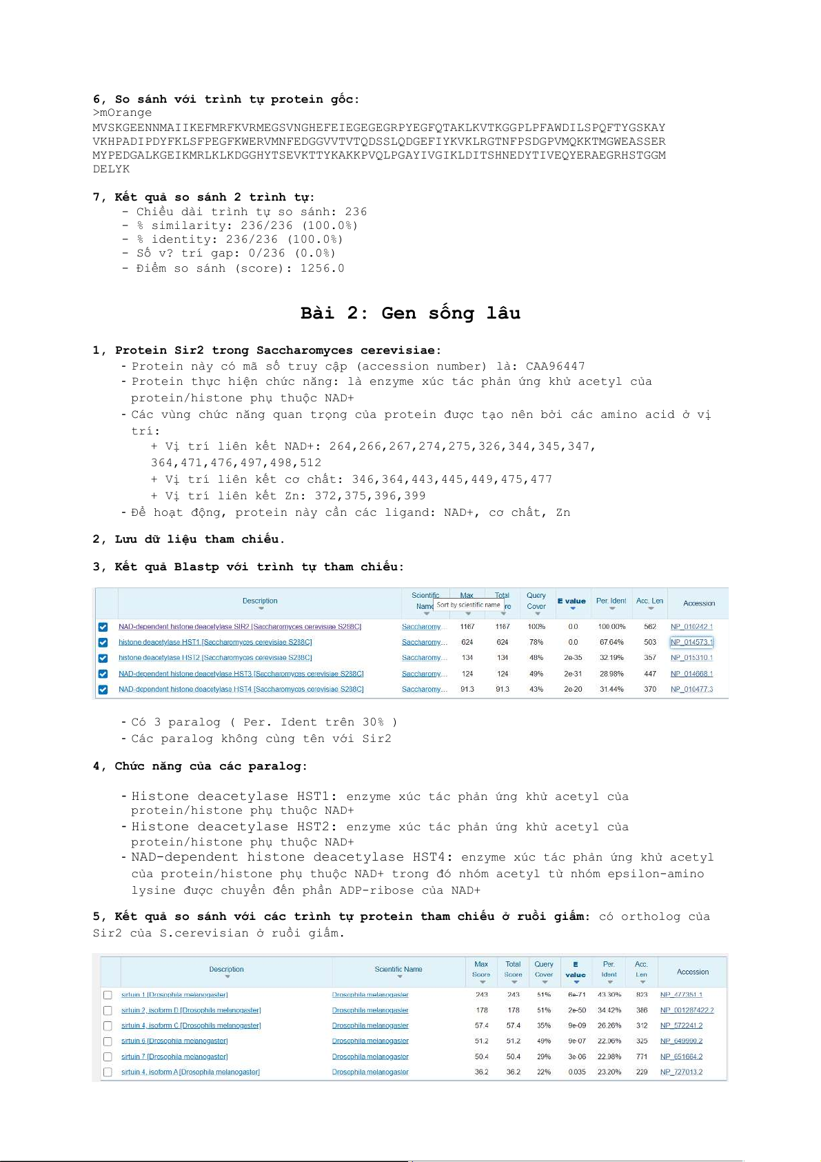 - Điểm so sánh (score): 1256.0 Bài 2: Gen sống lâu