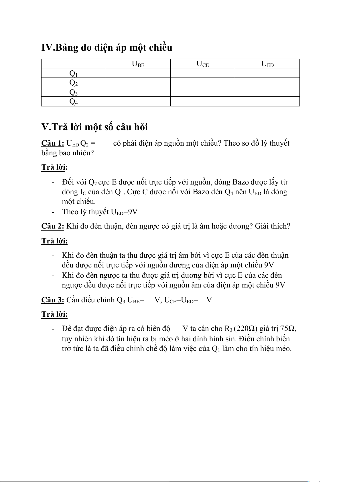 IV.Bảng đo điện áp một chiều UBE UCE UED Q1 Q2 Q3 Q4