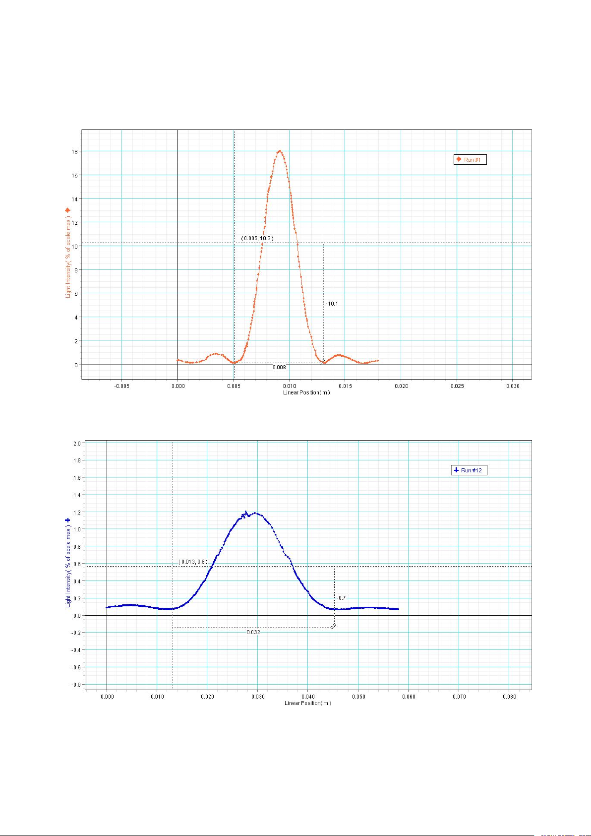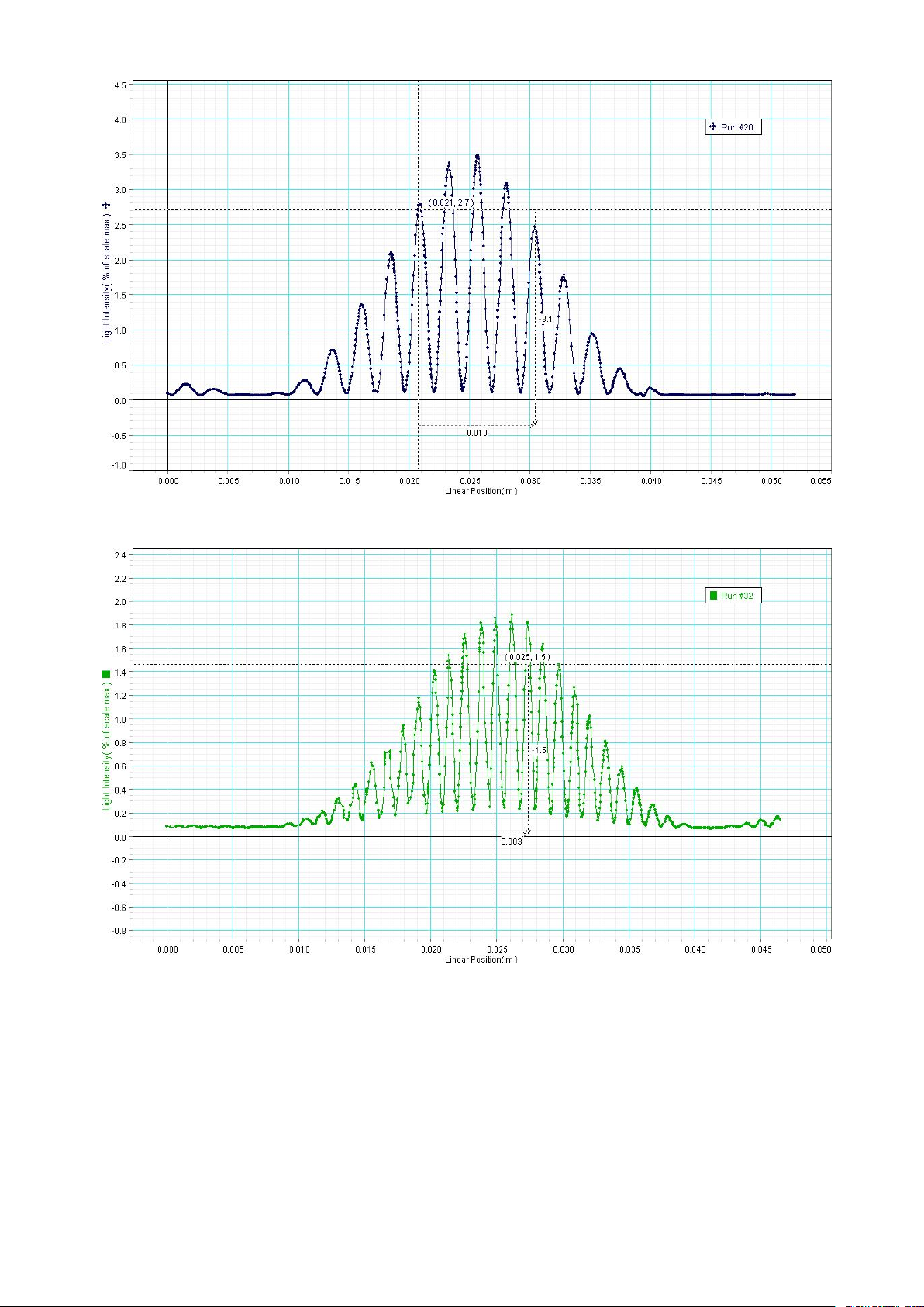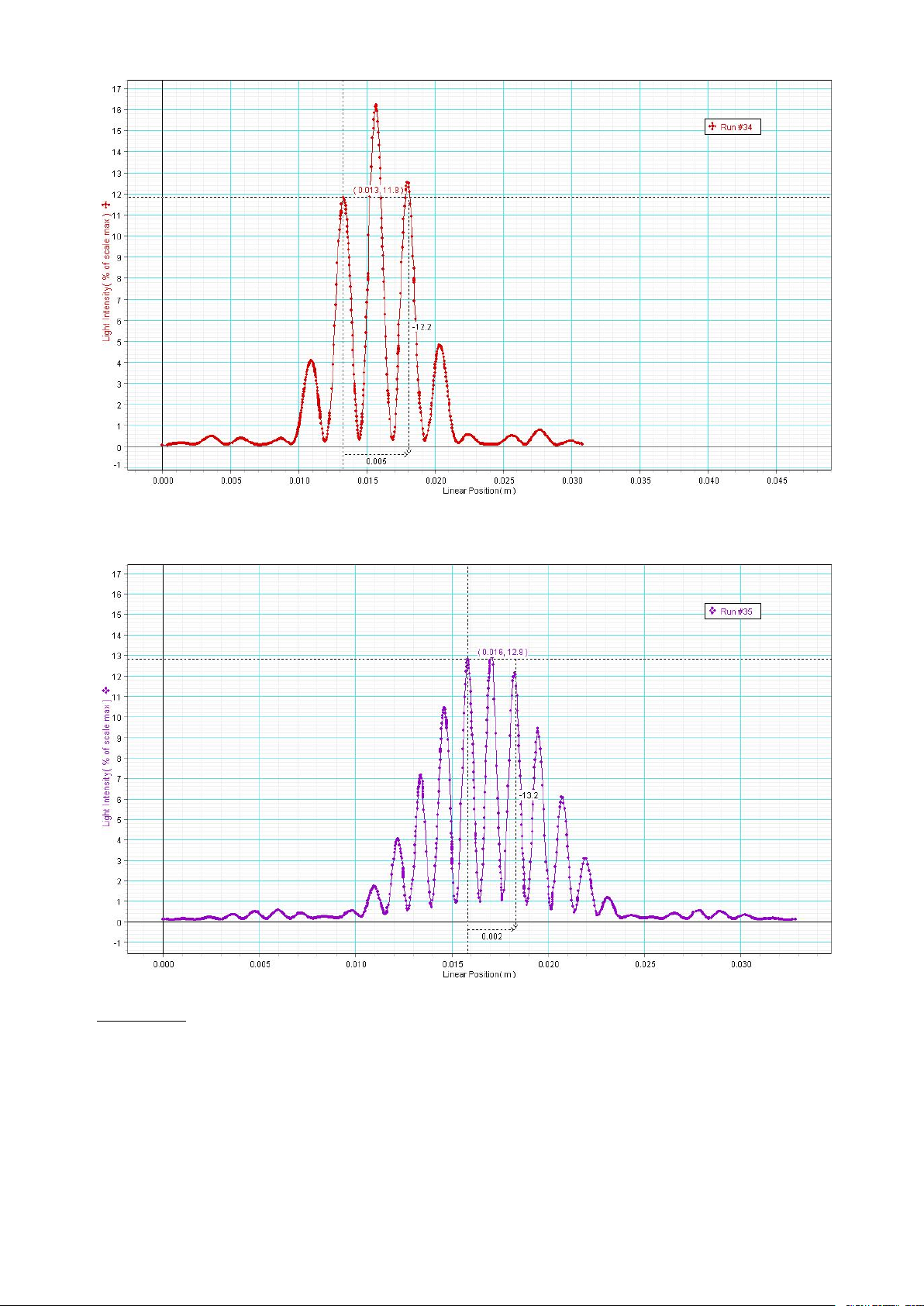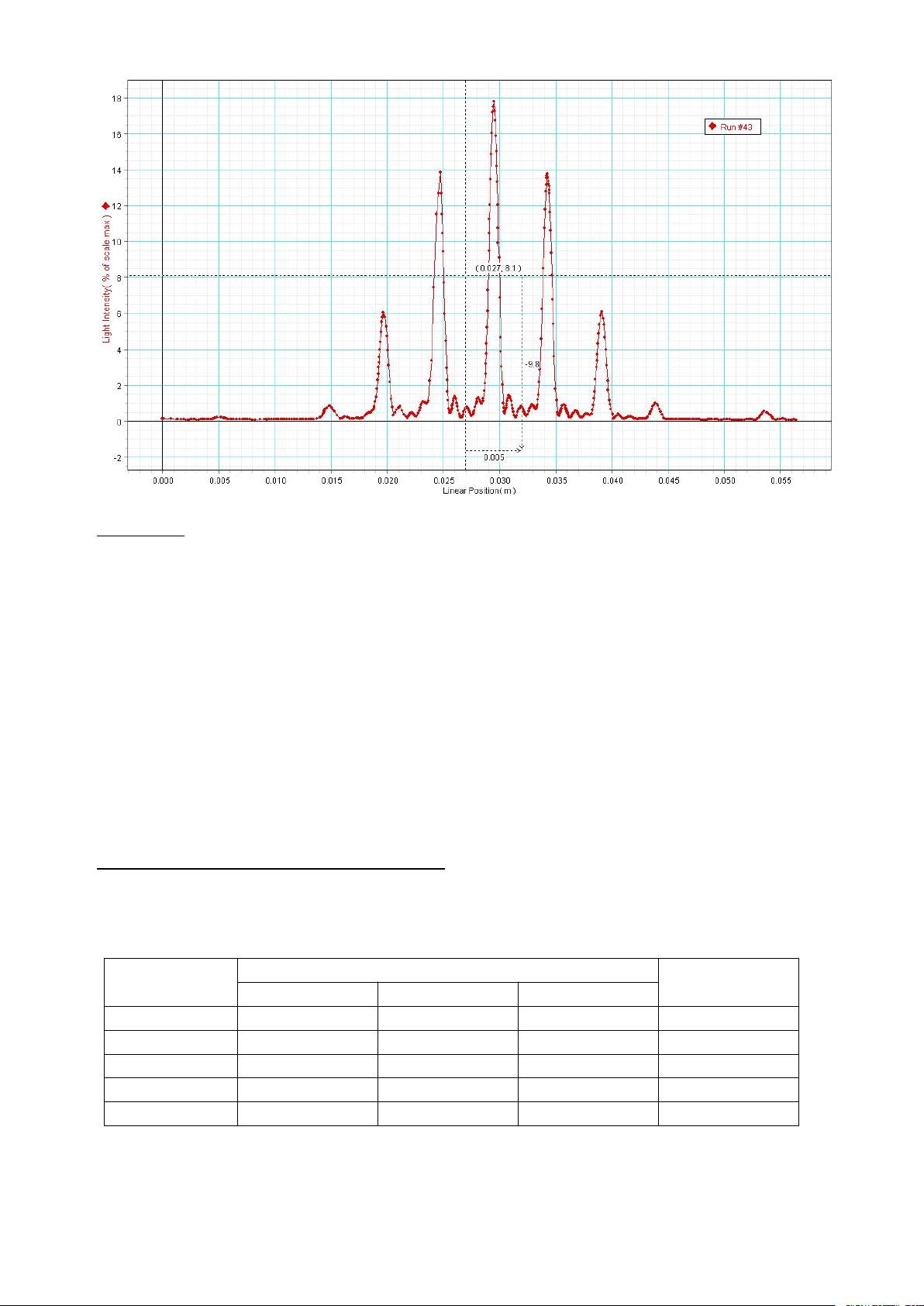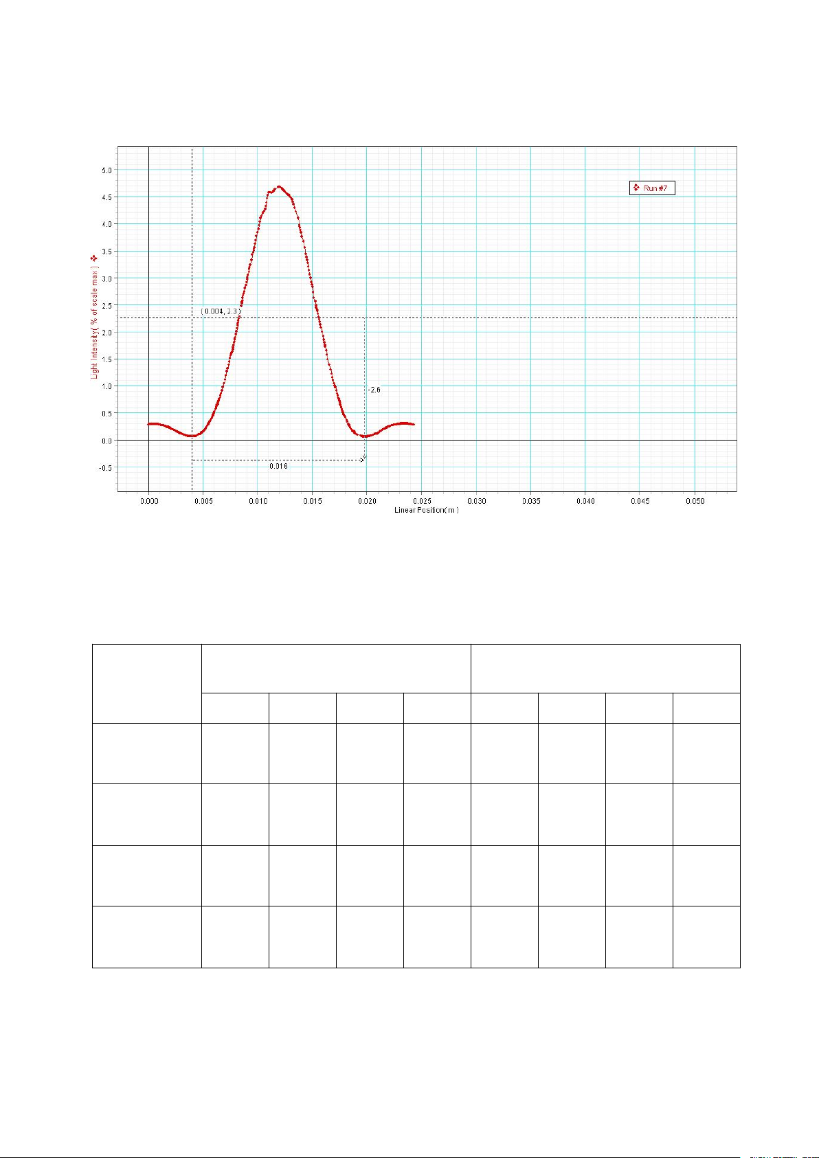 Khoảng cách giữa 2 vân cực đại bậc ± 1 (mm) bậc ± 2 (mm) Lần 1 Lần 2 Lần 3 TB Lần 1 Lần 2 Lần 3 TB a = 0,04 mm d = 0,25 mm 5 5 5 5 10 10 10 10 a = 0,04 mm d = 0,5 mm 3 3 3 3 5 5 5 5 a = 0,08 mm d = 0,25 mm 5 5 5 5 10 10 10 10 a = 0,08 mm d = 0,5 mm 2 2 2 2 5 5 5 5 a) Với a = 0,04 ; d = 0,25 b) a = 0,04 ; d = 0,5 c) a = 0,08 ; d = 0,25 d) a = 0,08 ; d = 0,5