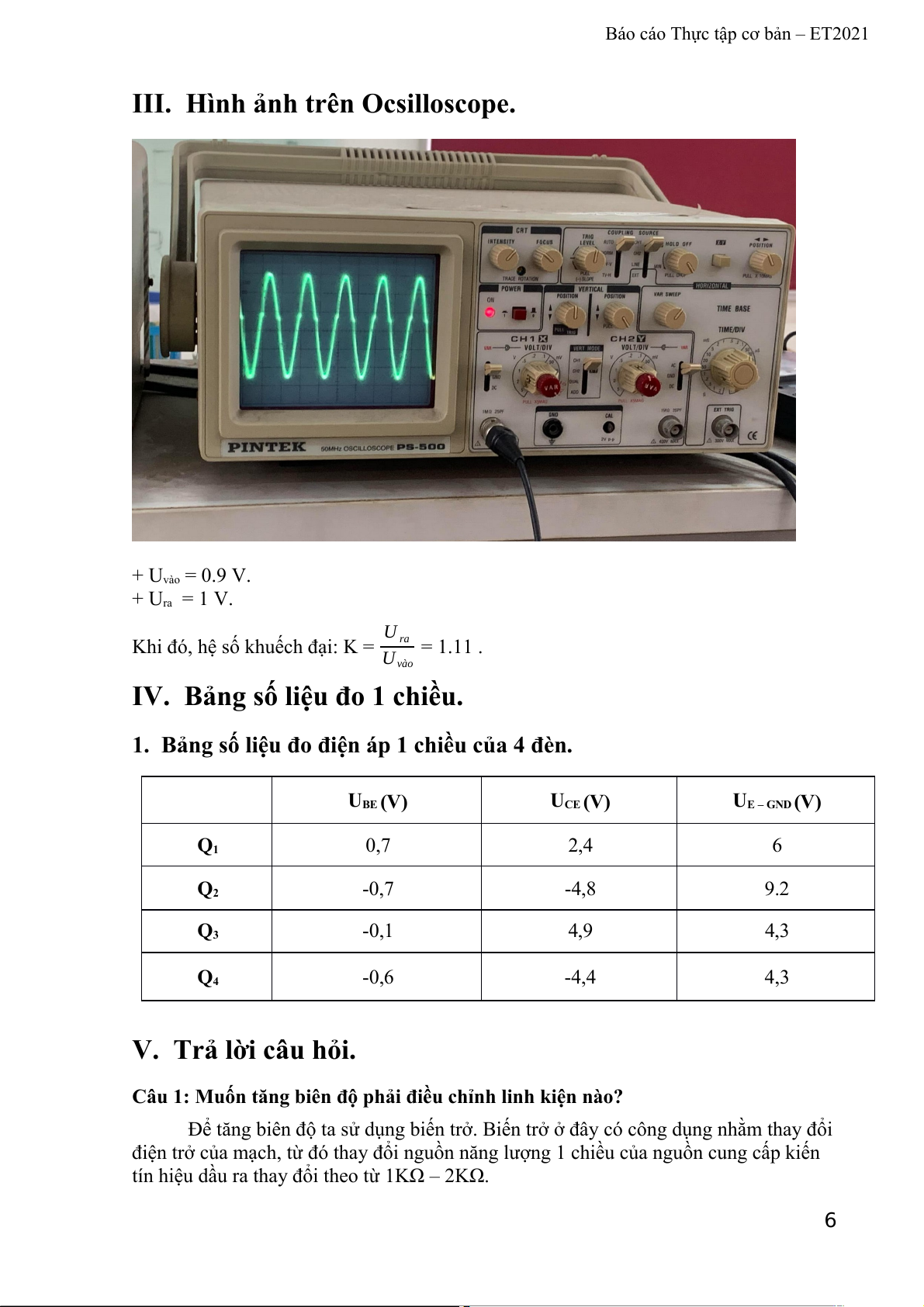 1. Bảng số liệu đo điện áp 1 chiều của 4 đèn. UBE (V) UCE (V)
