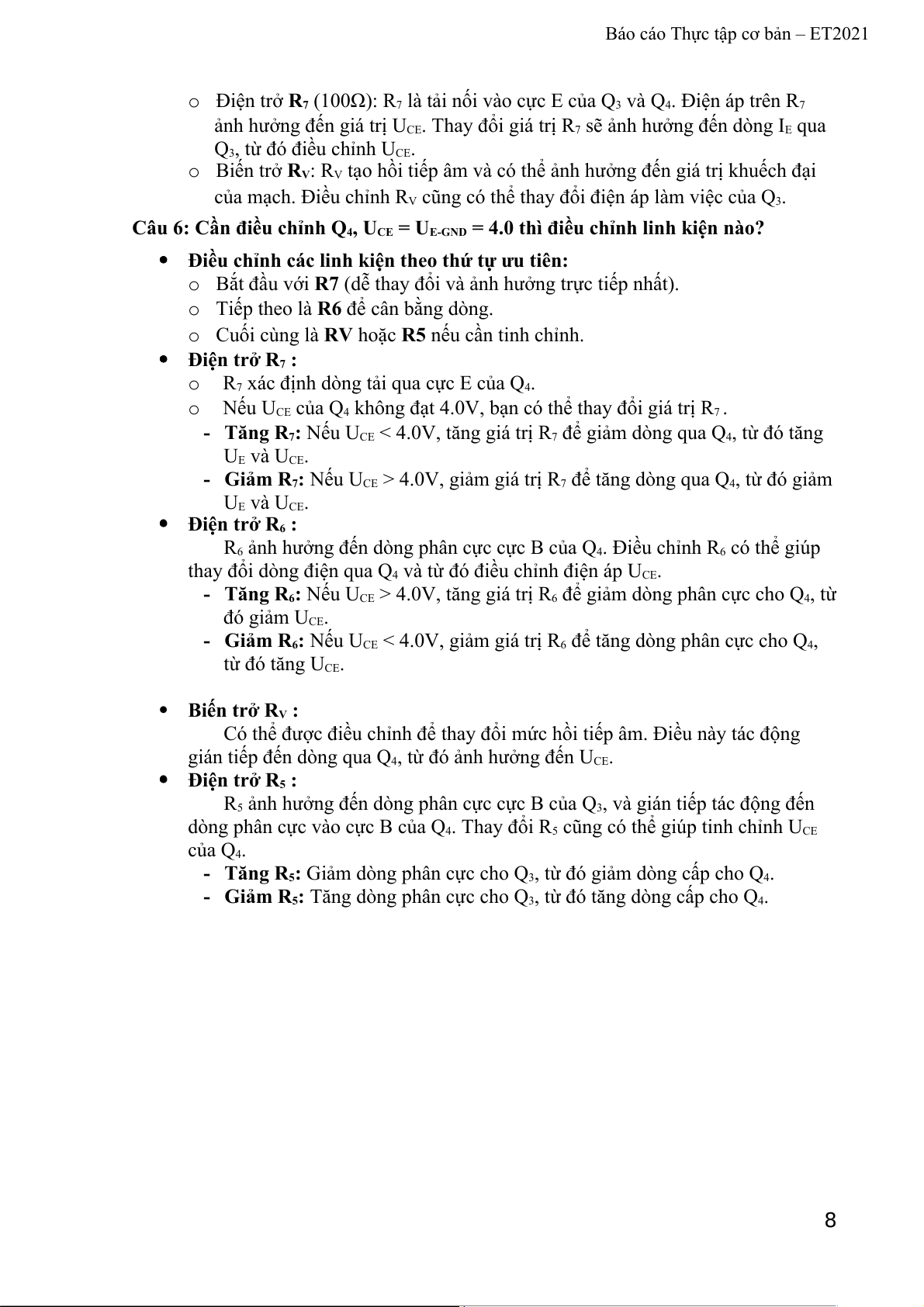 Câu 5: Cần điều chỉnh Q3, UBE = 0.5, UCE = UE-GND = 3.8 thì điều chỉnh linh kiện nào?