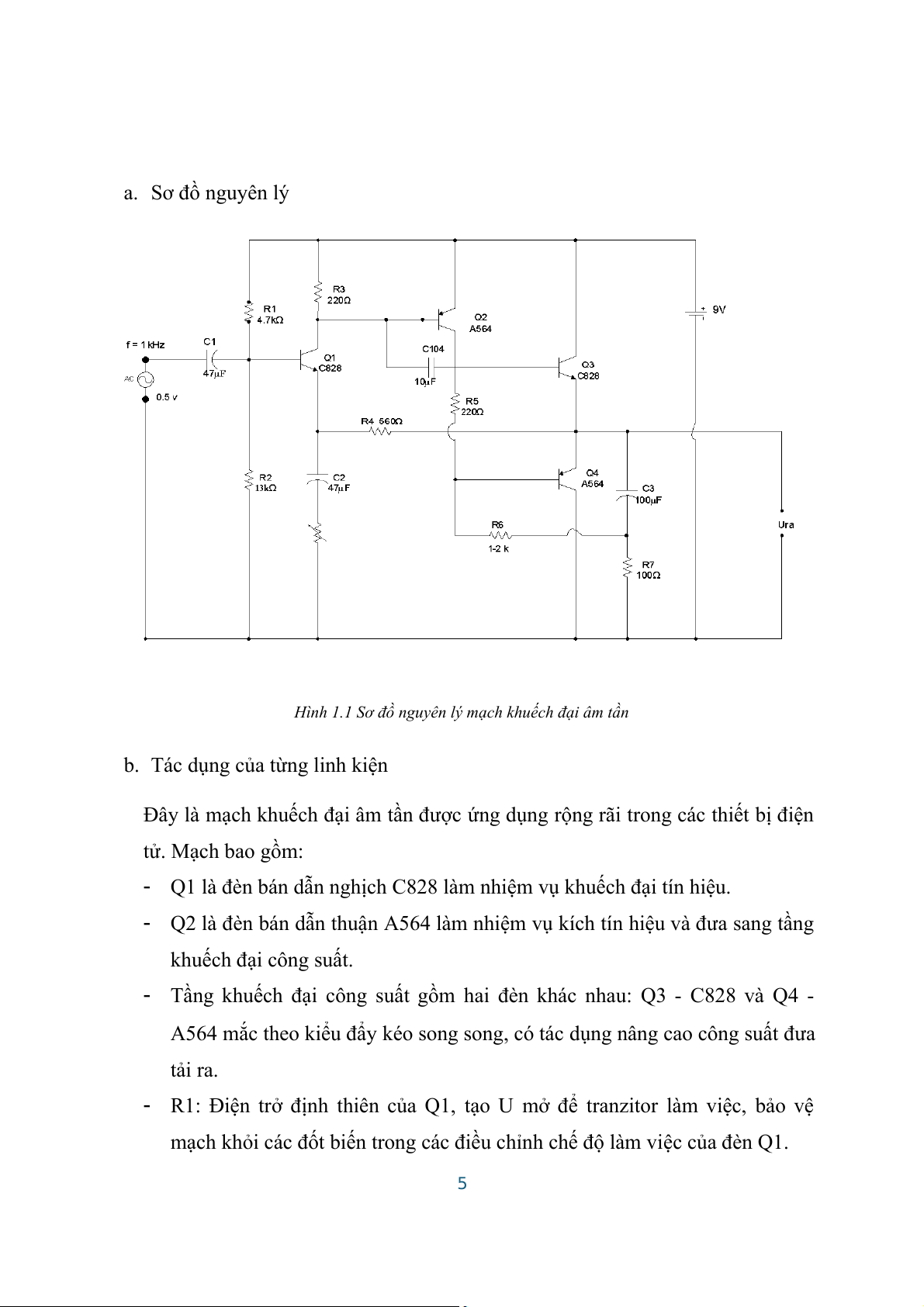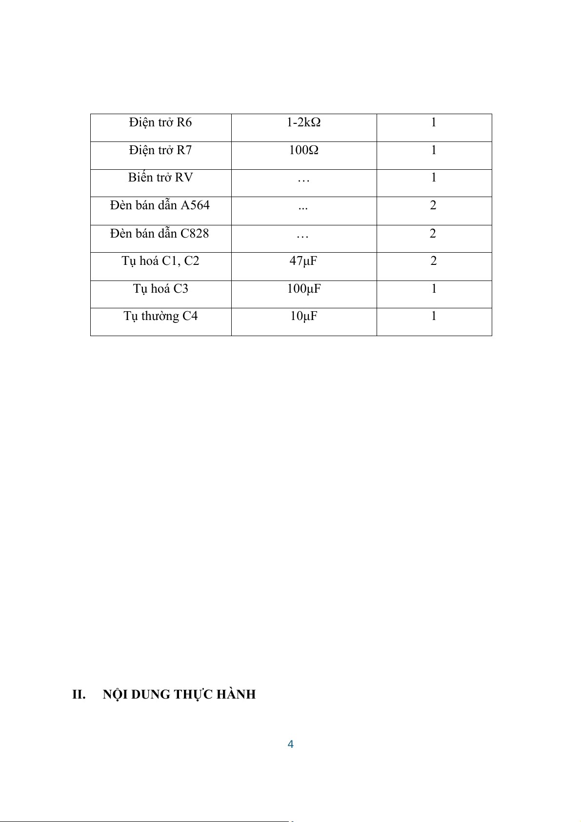 Mỏ hàn, thiếc, dây đồng, dụng cụ lắp ráp, cân chỉnh. ii. Linh kiện điện tử Linh kiện Giá trị Số lượng Điện trở R1 4,7k 1 Điện trở R2 13k 1 Điện trở R3,R5 220 2 Điện trở R4 560 1 3 Điện trở R6 1-2k 1 Điện trở R7 100 1 Biến trở RV … 1 Đèn bán dẫn A564 ... 2 Đèn bán dẫn C828 … 2 Tụ hoá C1, C2 47μF 2 Tụ hoá C3 100μF 1 Tụ thường C4 10μF 1 II. NỘI DUNG THỰC HÀNH 4 a. Sơ đồ nguyên lý