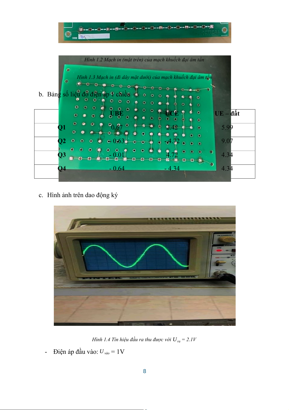 b. Bảng số liệu đo điện áp 1 chiều UBE UCE UE – đất Q1 0.67 2.42 5.99 Q2 - 0.63 - 4.72 9.07 Q3 - 0.01 4.72 4.34 Q4 - 0.64 - 4.34 4.34