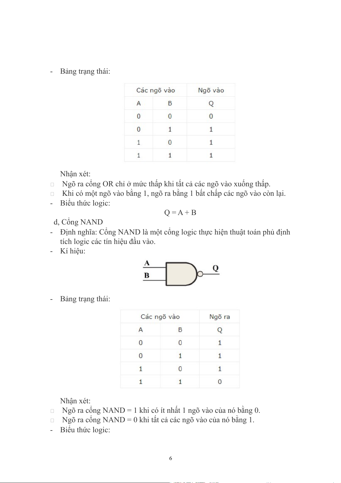 - Định nghĩa: Cổng OR là một cổng logic thực hiện thuật toán tổng logic các tín hiệu đầu vào. - Kí hiệu: 5 - Bảng trạng thái: Nhận xét: