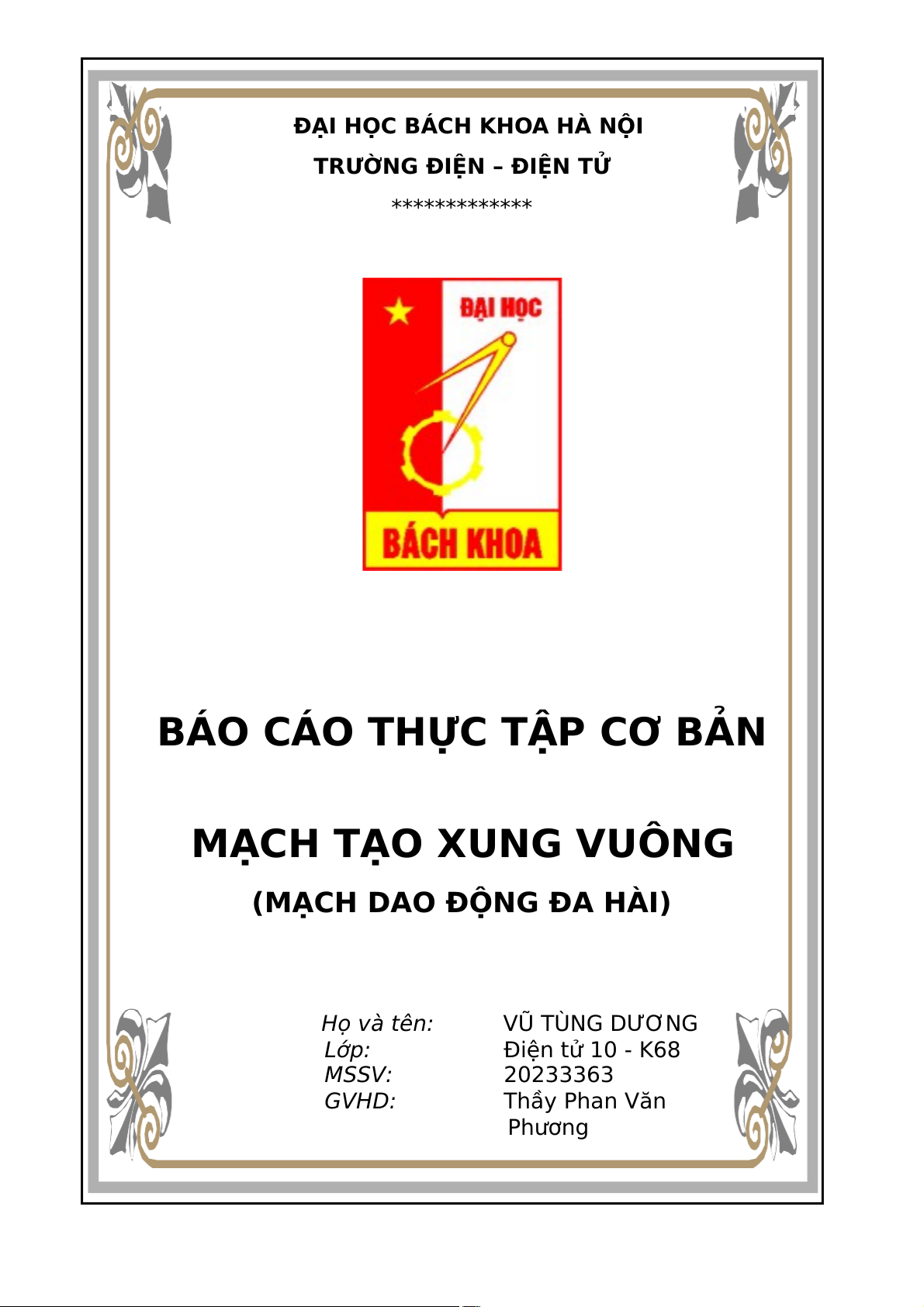 (MẠCH DAO ĐỘNG ĐA HÀI) Họ và tên: VŨ TÙNG DƯƠNG Lớp: Điện tử 10 - K68 MSSV: 20233363 GVHD: Thầy Phan Văn Phương M$c l$c