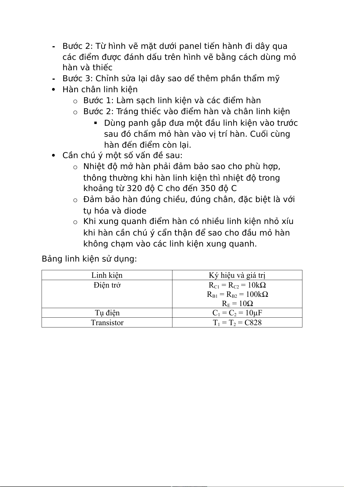 không chạm vào các linh kiện xung quanh. Bảng linh kiện sử d$ng: Linh kiện Ký hiệu và giá trị Điện trở RC1 = RC2 = 10kΩ RB1 = RB2 = 100kΩ RE = 10Ω Tụ điện C1 = C2 = 10µF Transistor T1 = T2 = C828