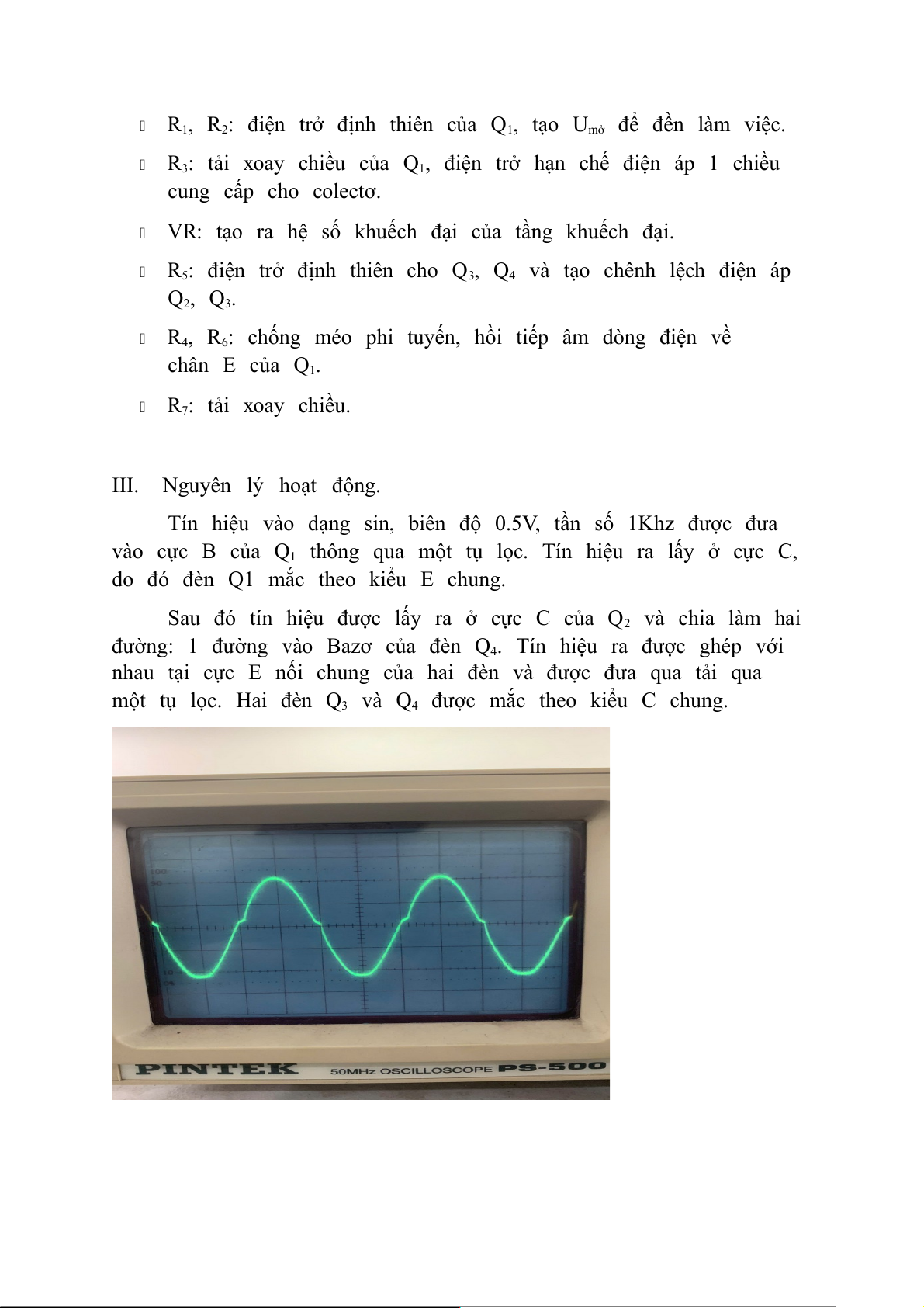 R4, R6: chống méo phi tuyến, hồi tiếp âm dòng điện về chân E của Q1. R7: tải xoay chiều.