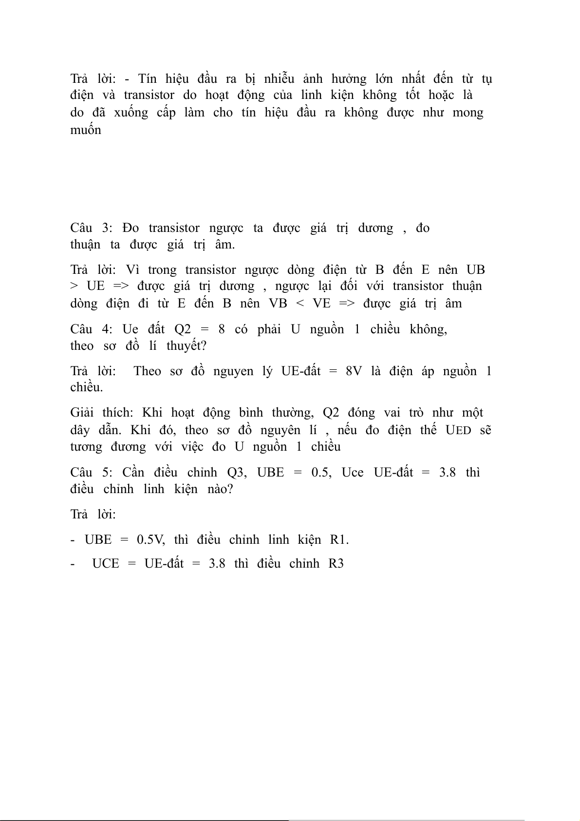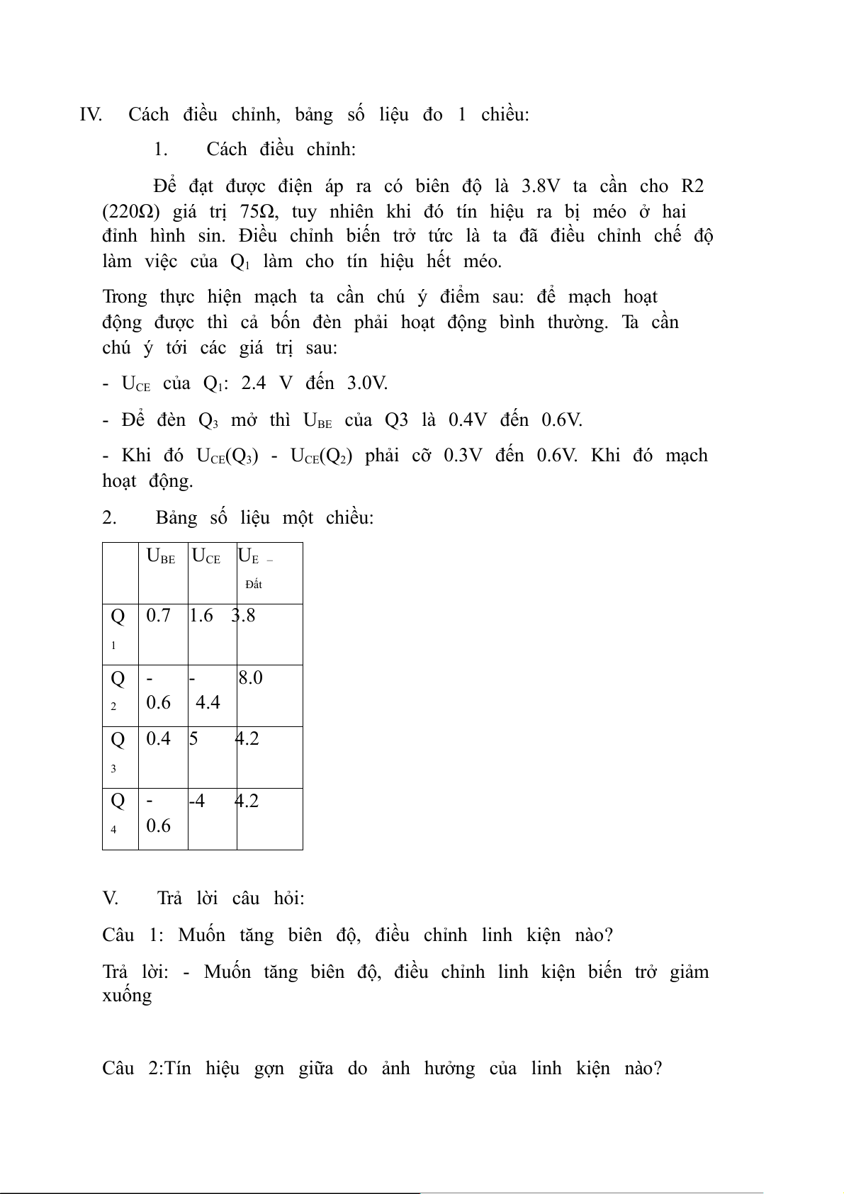Câu 5: Cần điều chỉnh Q3, UBE = 0.5, Uce UE-đất = 3.8 thì