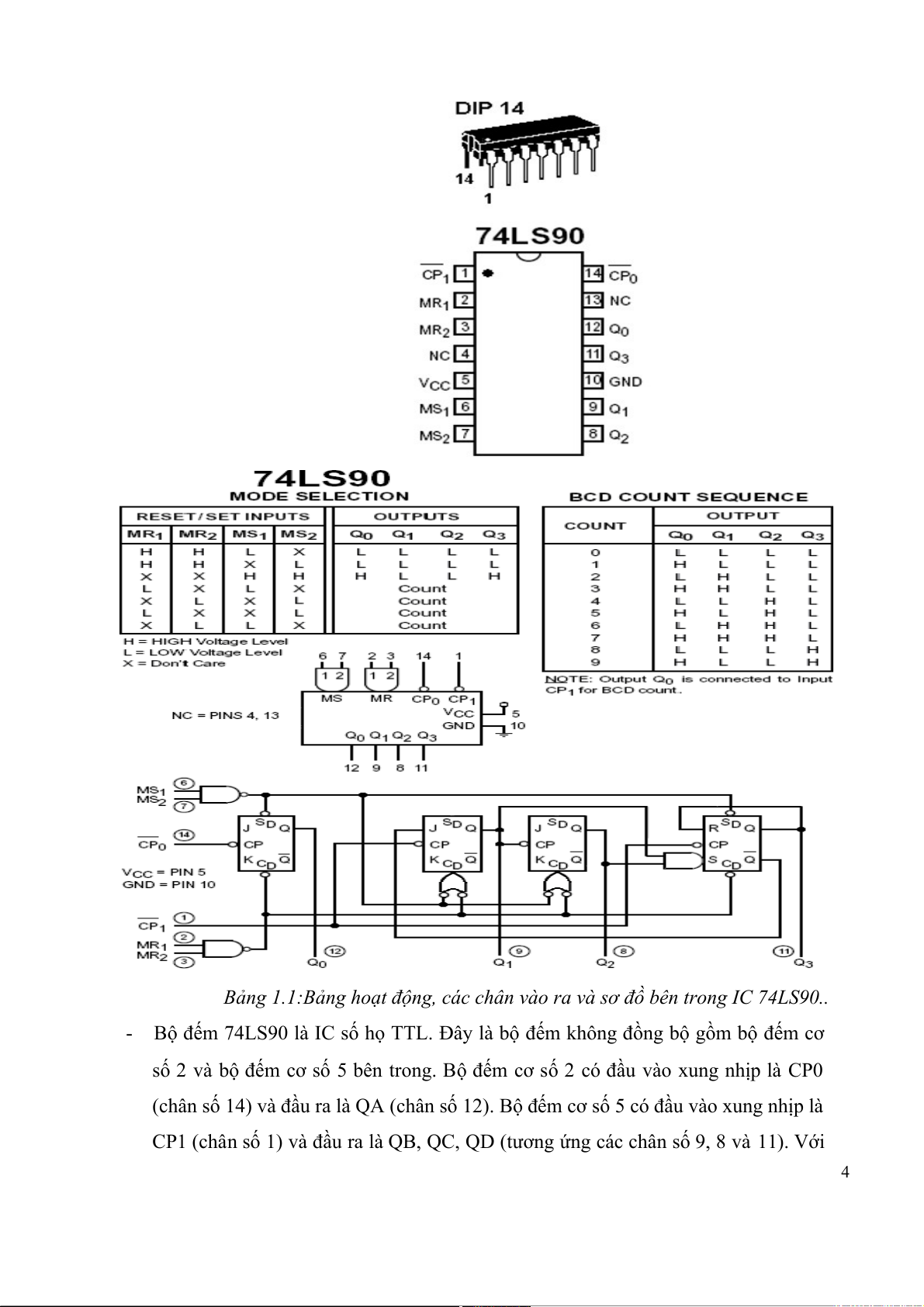 Bảng 1.1:Bảng hoạt động, các chân vào ra và sơ đồ bên trong IC74LS90...............4