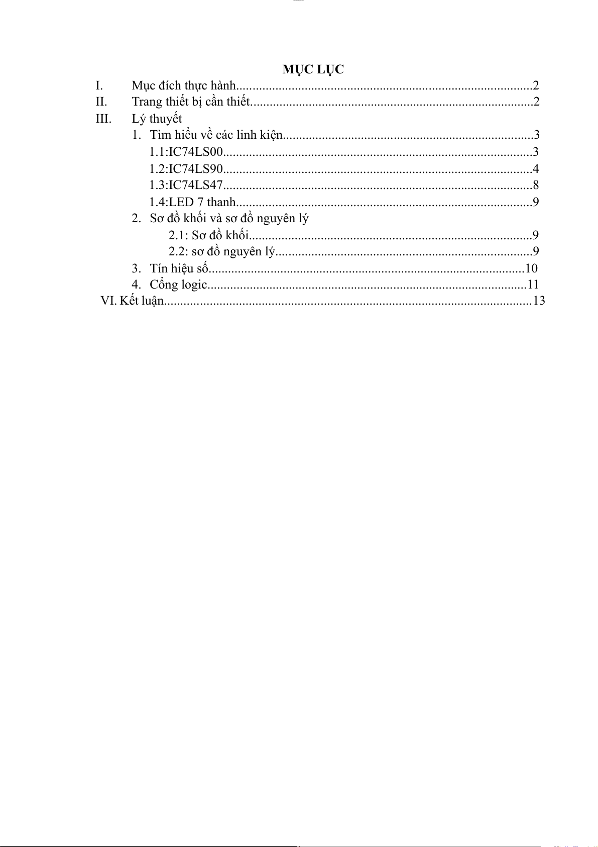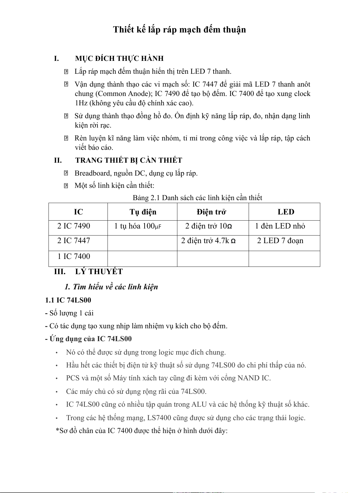 Bảng 2.1 Danh sách các linh kiện cần thiết IC Tụ điện Điện trở LED 2 IC 7490 1 tụ hóa 100µF 2 điện trở 10Ω 1 đèn LED nhỏ 2 IC 7447 2 điện trở 4.7k Ω 2 LED 7 đoạn 1 IC 7400 III. LÝ THUYẾT