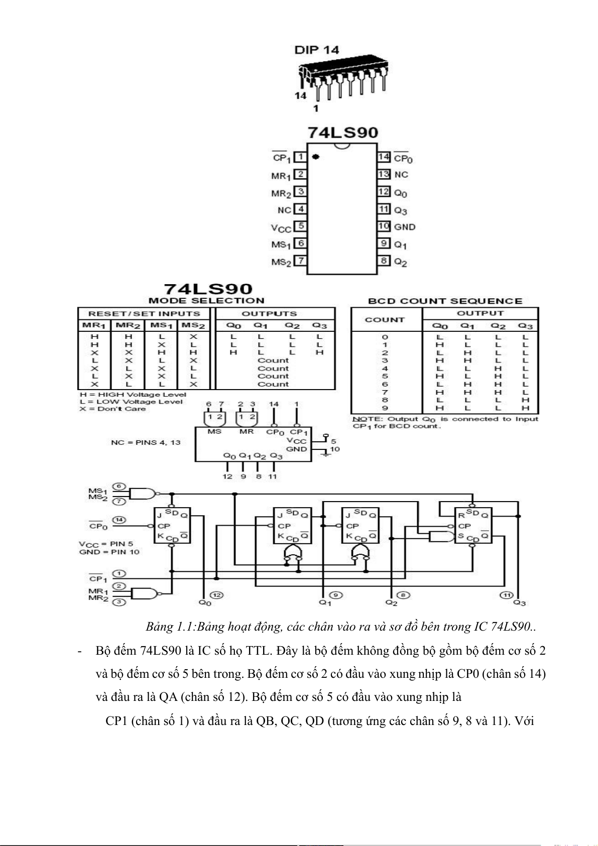 Bảng 1.1:Bảng hoạt động, các chân vào ra và sơ đồ bên trong IC74LS90...............4