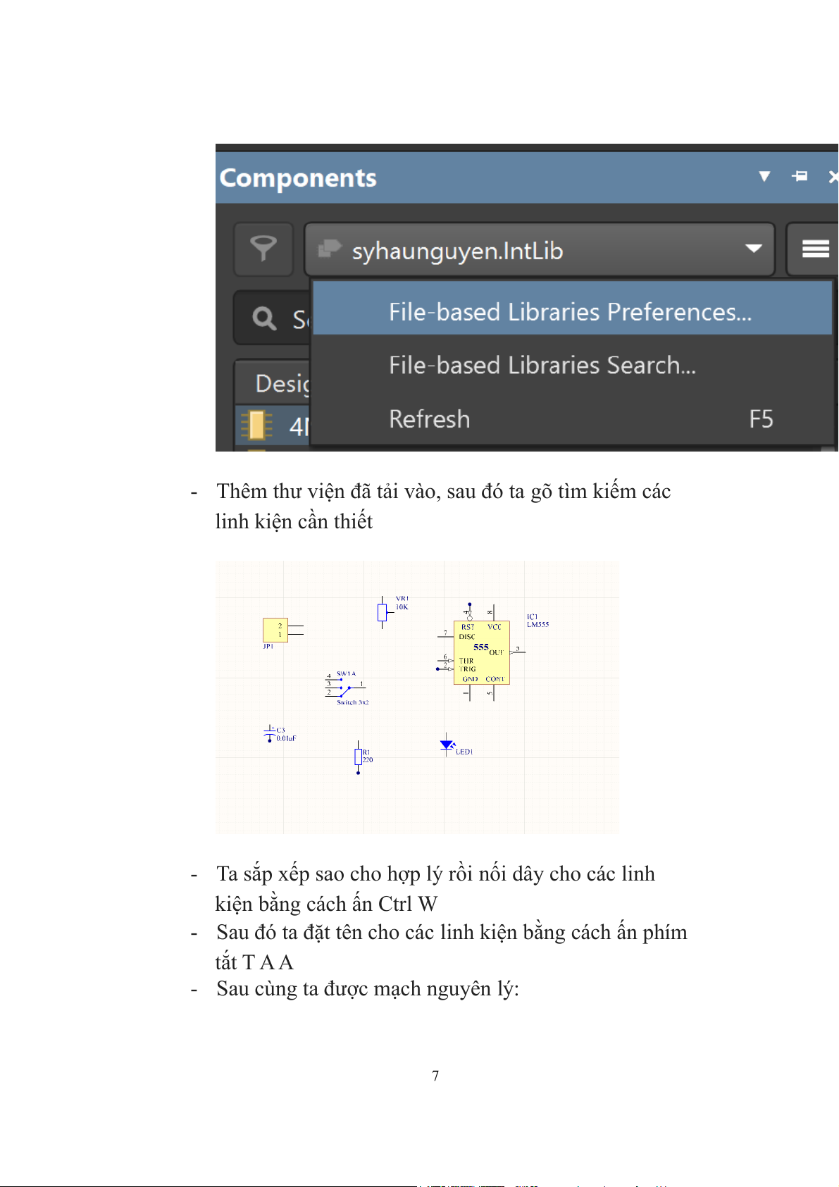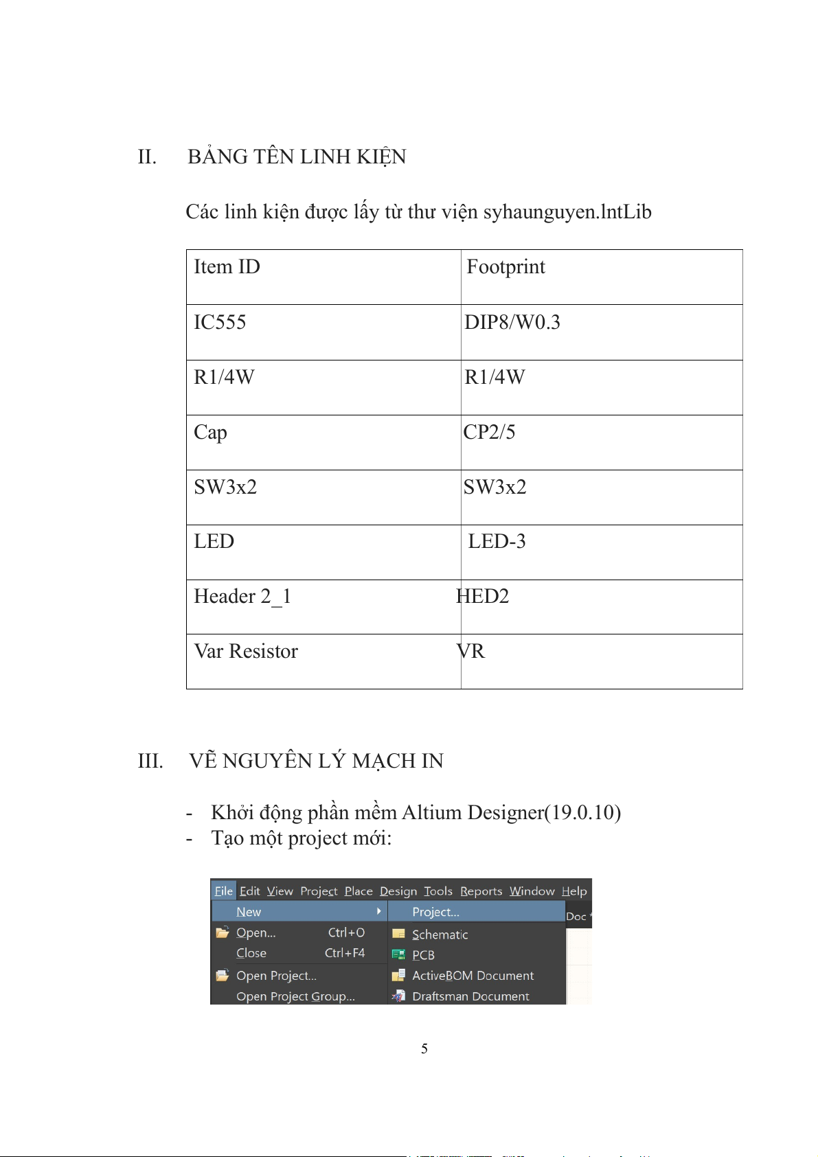 Các linh kiện được lấy từ thư viện syhaunguyen.lntLib Item ID Footprint IC555 DIP8/W0.3 R1/4W R1/4W Cap CP2/5 SW3x2 SW3x2 LED LED-3 Header 2_1 HED2 Var Resistor VR III. VẼ NGUYÊN LÝ MẠCH IN