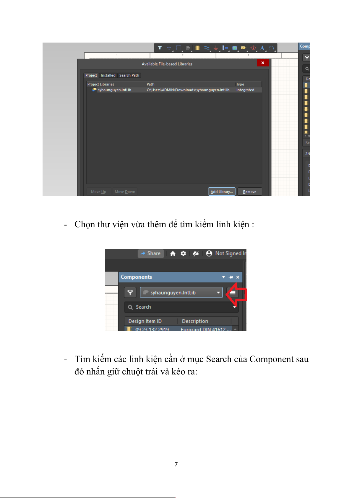 - Chọn thư viện vừa thêm để tìm kiếm linh kiện :