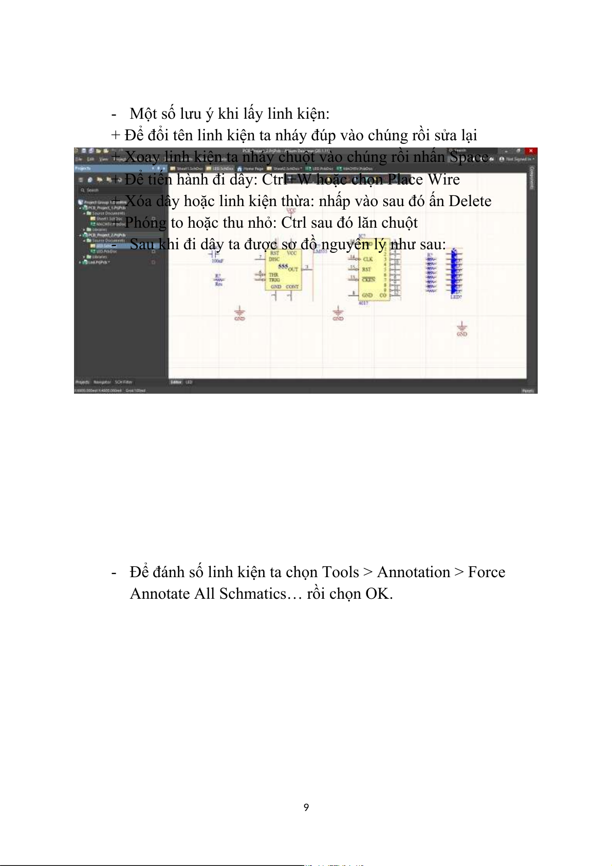 + Để tiến hành đi dây: Ctrl+W hoặc chọn Place Wire
