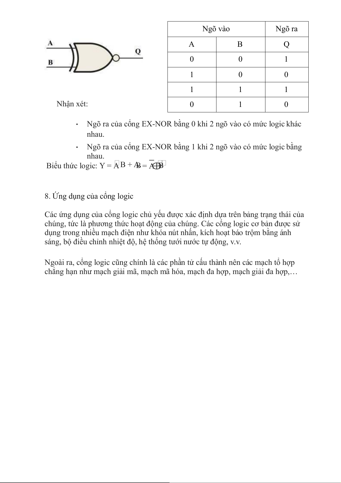 Ngõ ra của cổng EX-NOR bằng 1 khi 2 ngõ vào có mức logic bằng nhau.