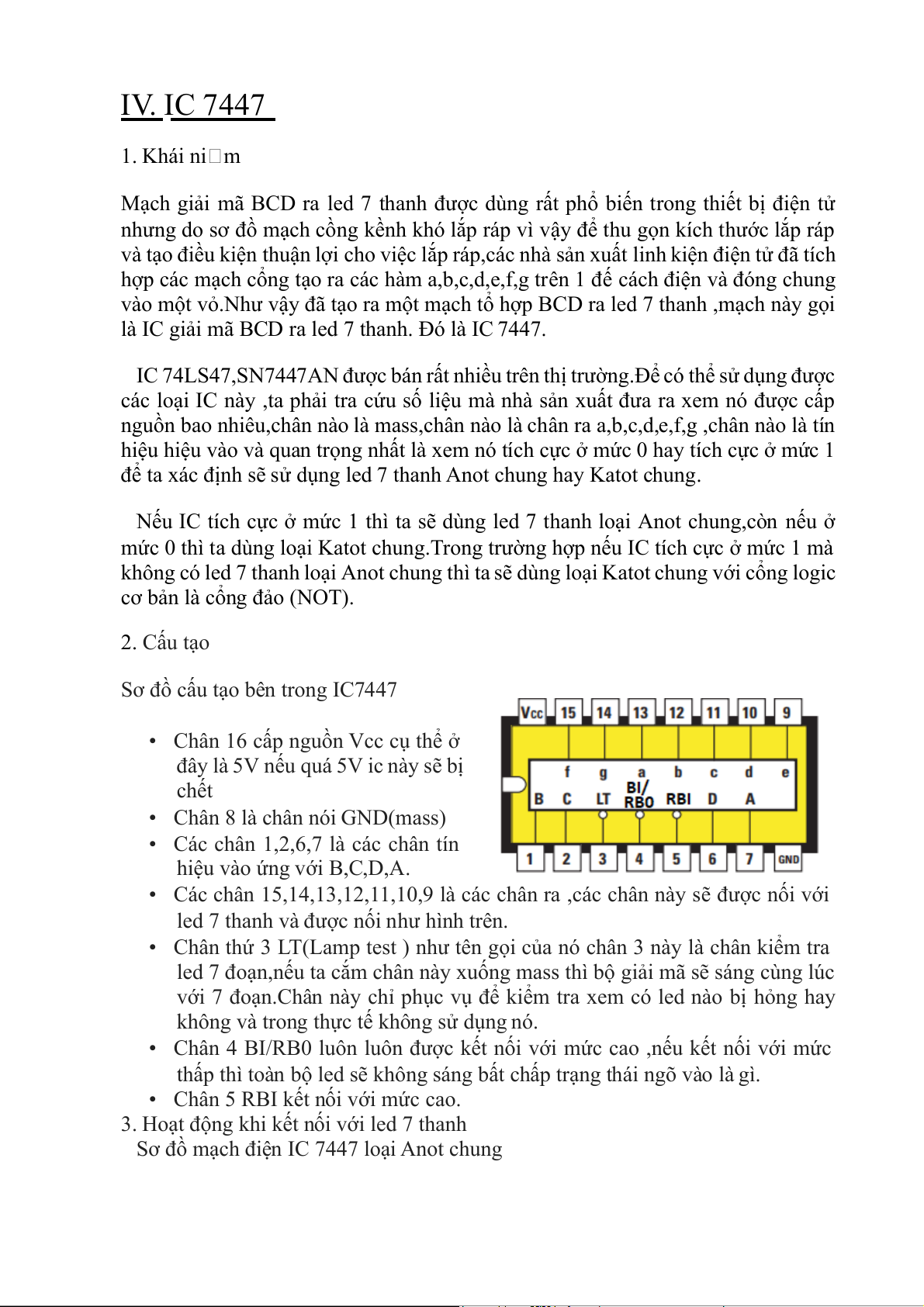 2. Cấu tạo và thông số kĩ thuật 3. Ứng dụng IV. IC 7447 1. Khái niệm 2. Cấu tạo