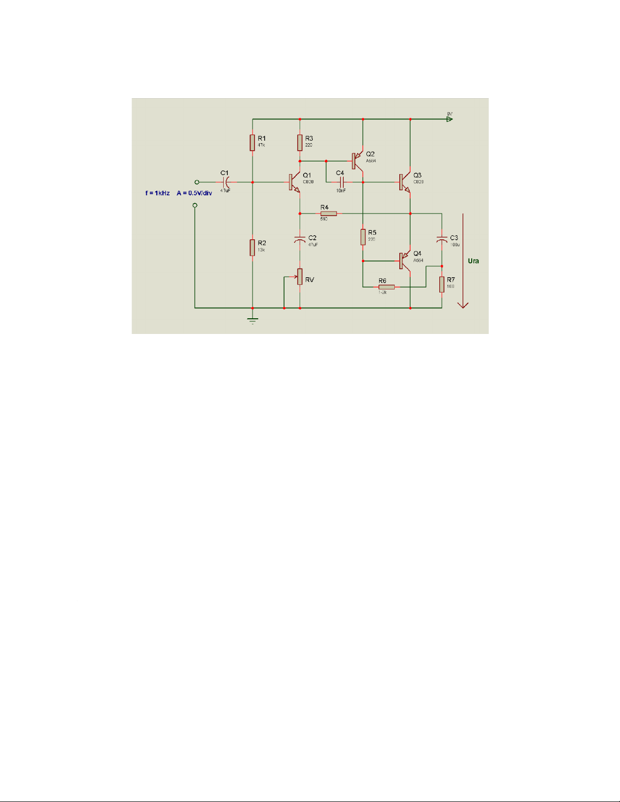 Tín hiệu vào dạng sin, biên độ 0.5V, tần số 1Khz được đưa vào cực B của Q1 thông