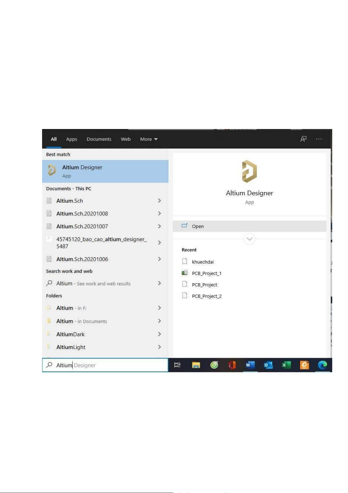 - Ấn tổ hợp nút Window+S -> gõ Altium -> Open.