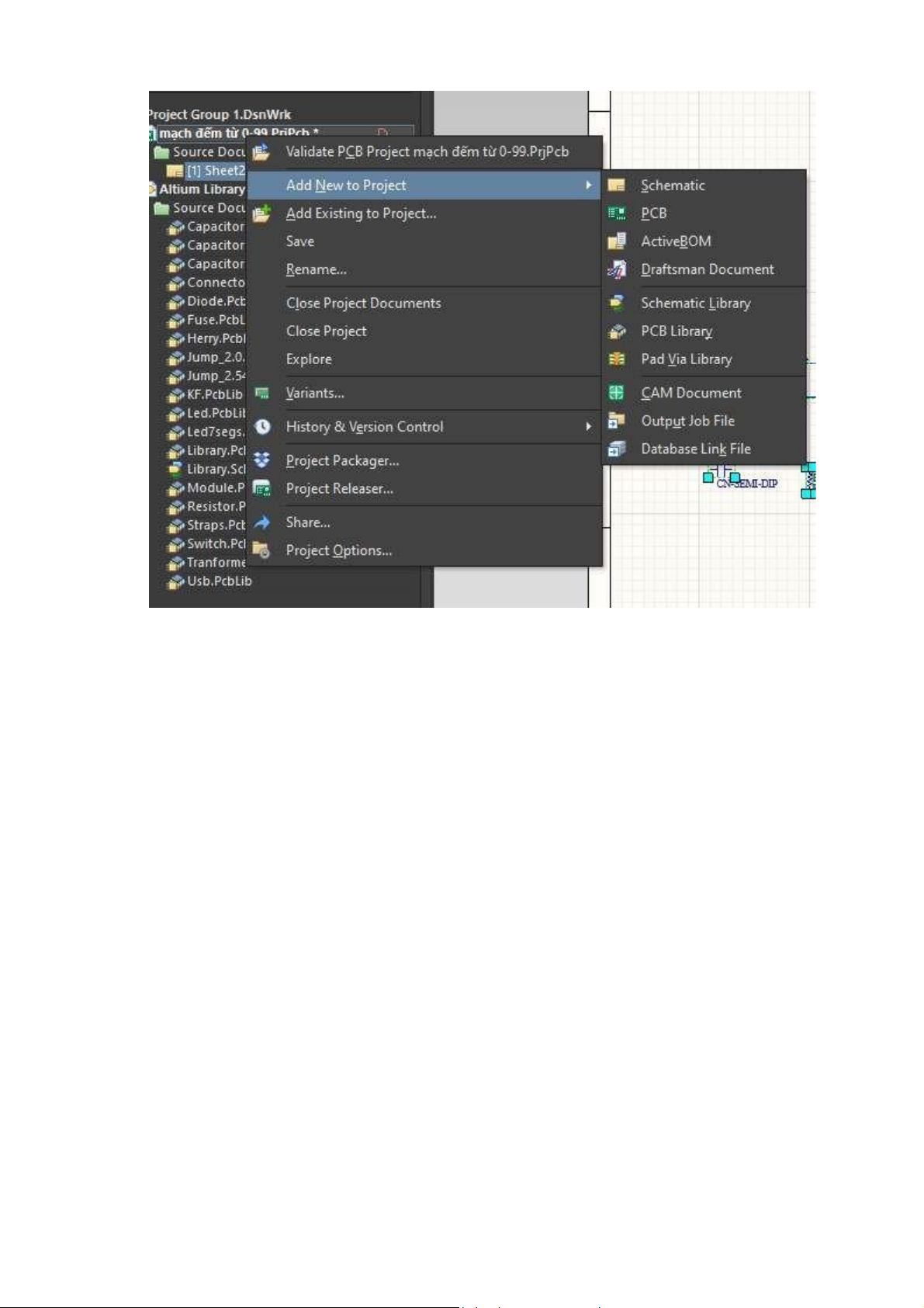 Project, ta sẽ tạo mạch nguyên lí bằng cách nhấp chuột phải vào