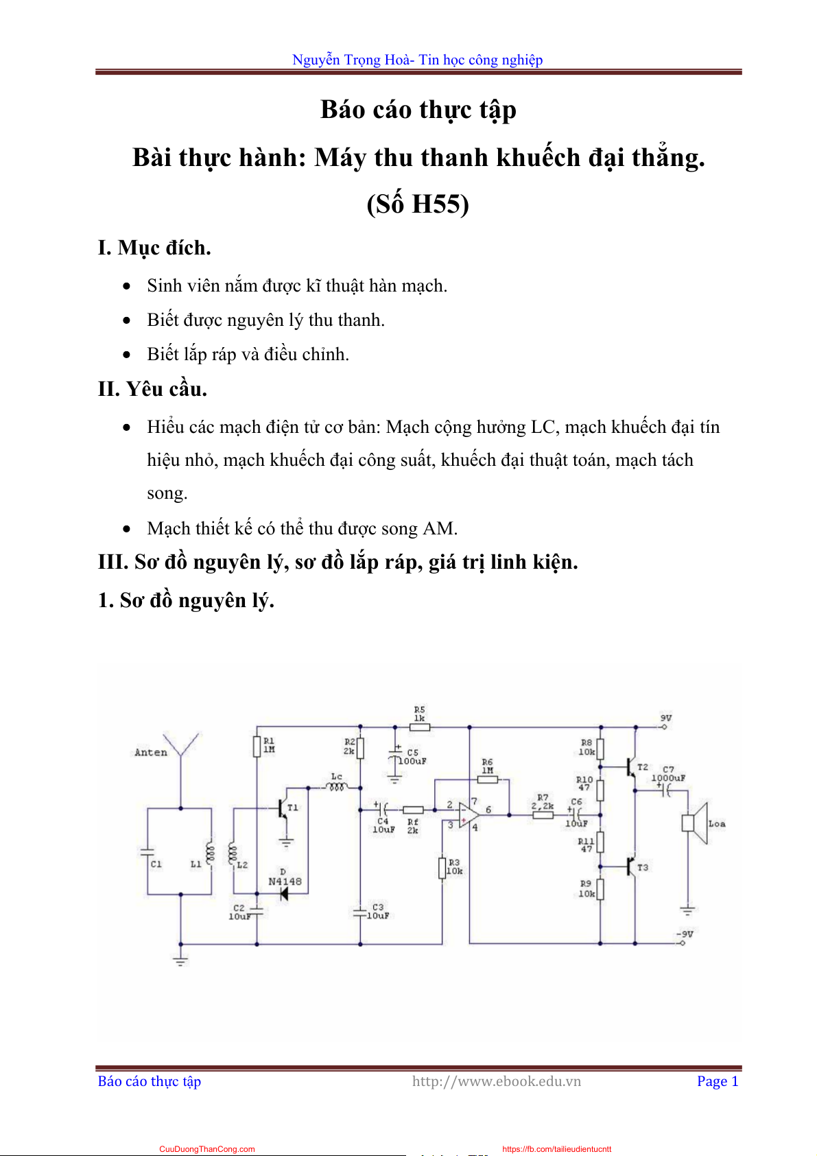 • Tranzitor T1, T2 là C828 , T3 là loại A564. • Điôt là loại N4148. Báo cáo thực tập http://www.ebook.edu.vn Page 3 CuuDuongThanCong.com