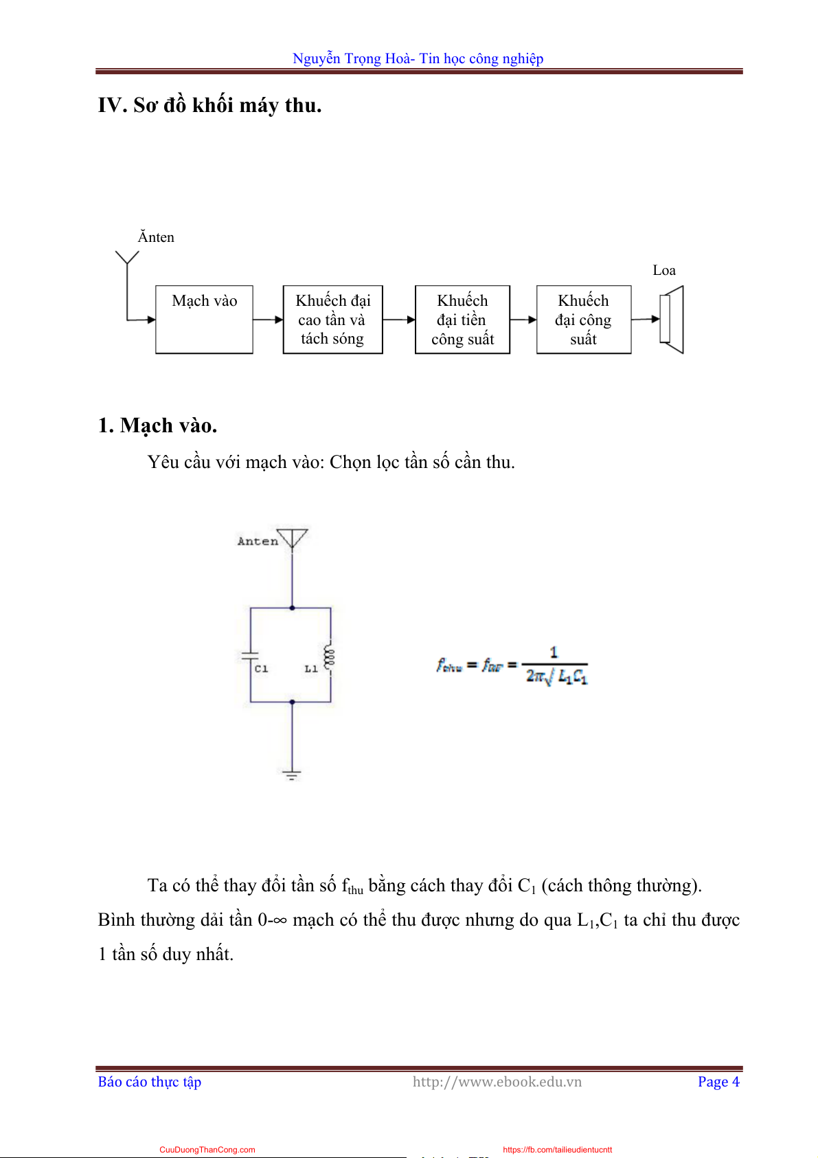 Bình thường dải tần 0-∞ mạch có thể thu được nhưng do qua L1,C1 ta chỉ thu được 1 tần số duy nhất. Báo cáo thực tập http://www.ebook.edu.vn Page 4 CuuDuongThanCong.com