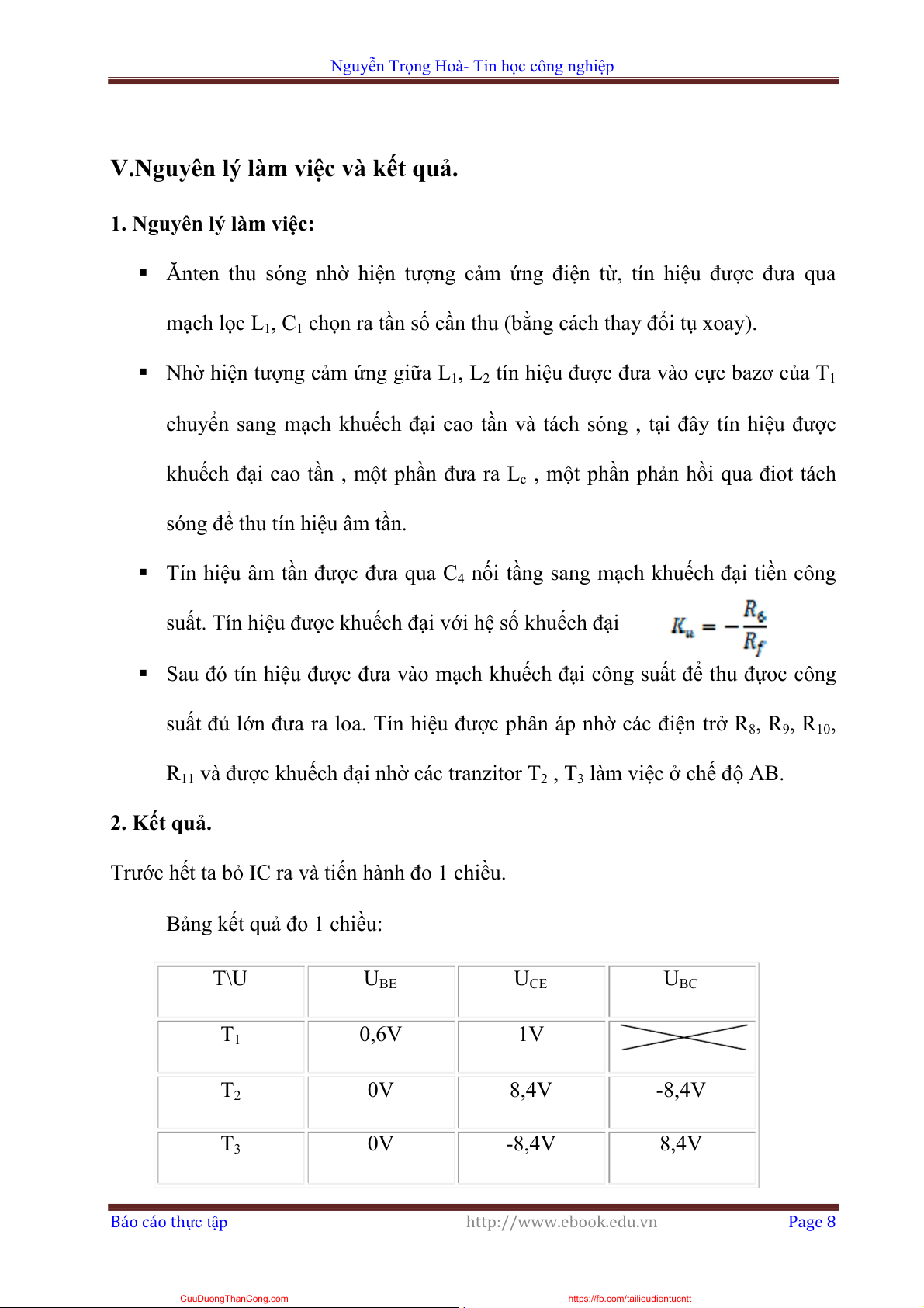 Bảng kết quả đo 1 chiều: T\U UBE UCE UBC T1 0,6V 1V T2 0V 8,4V -8,4V T3 0V -8,4V 8,4V Báo cáo thực tập http://www.ebook.edu.vn Page 8 CuuDuongThanCong.com