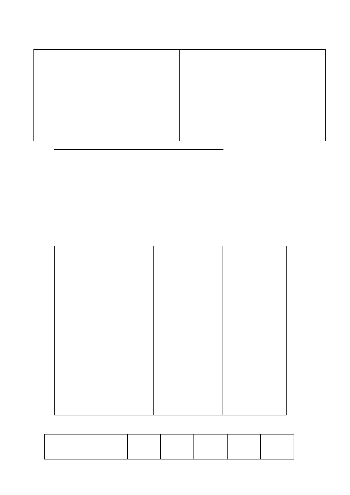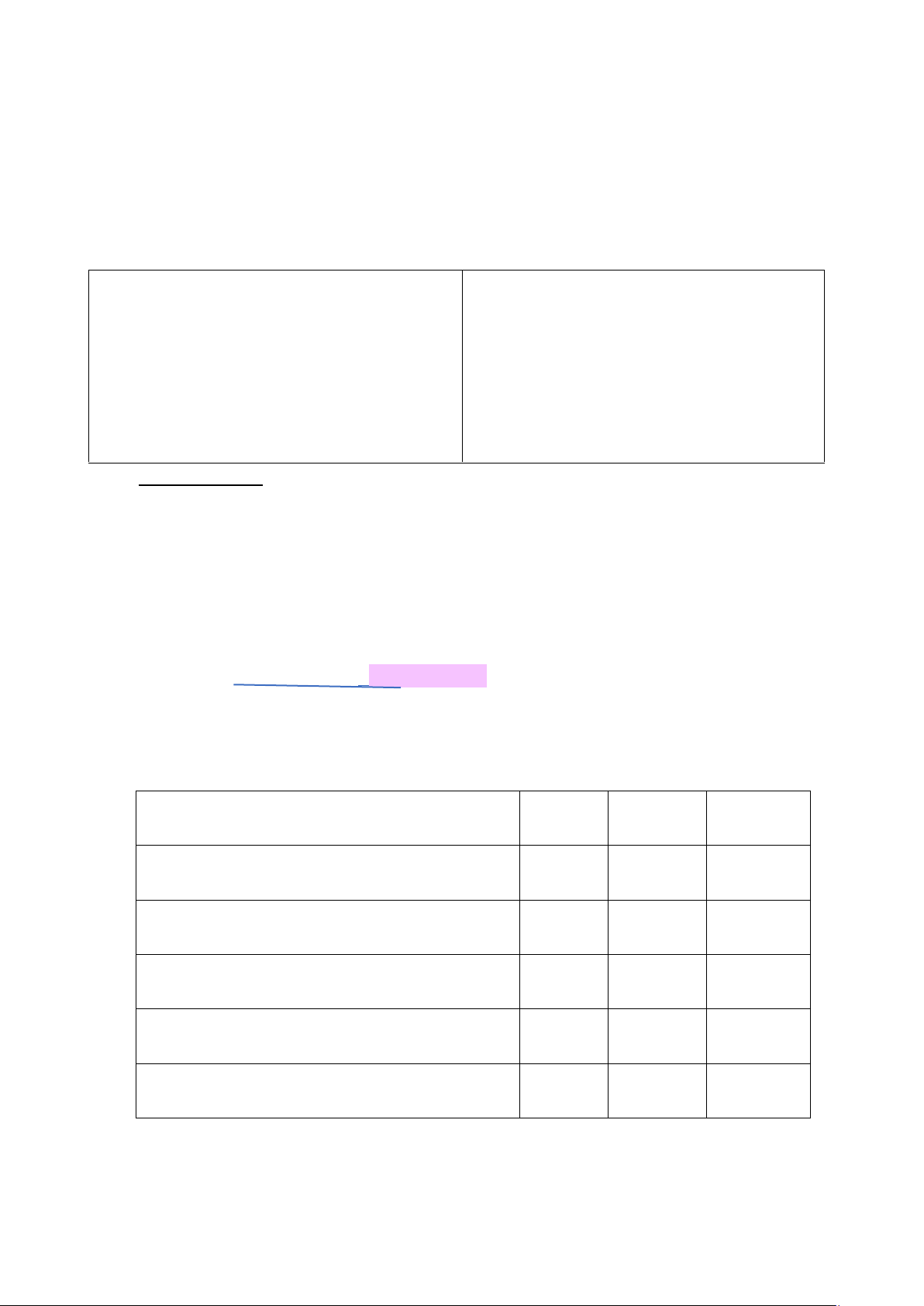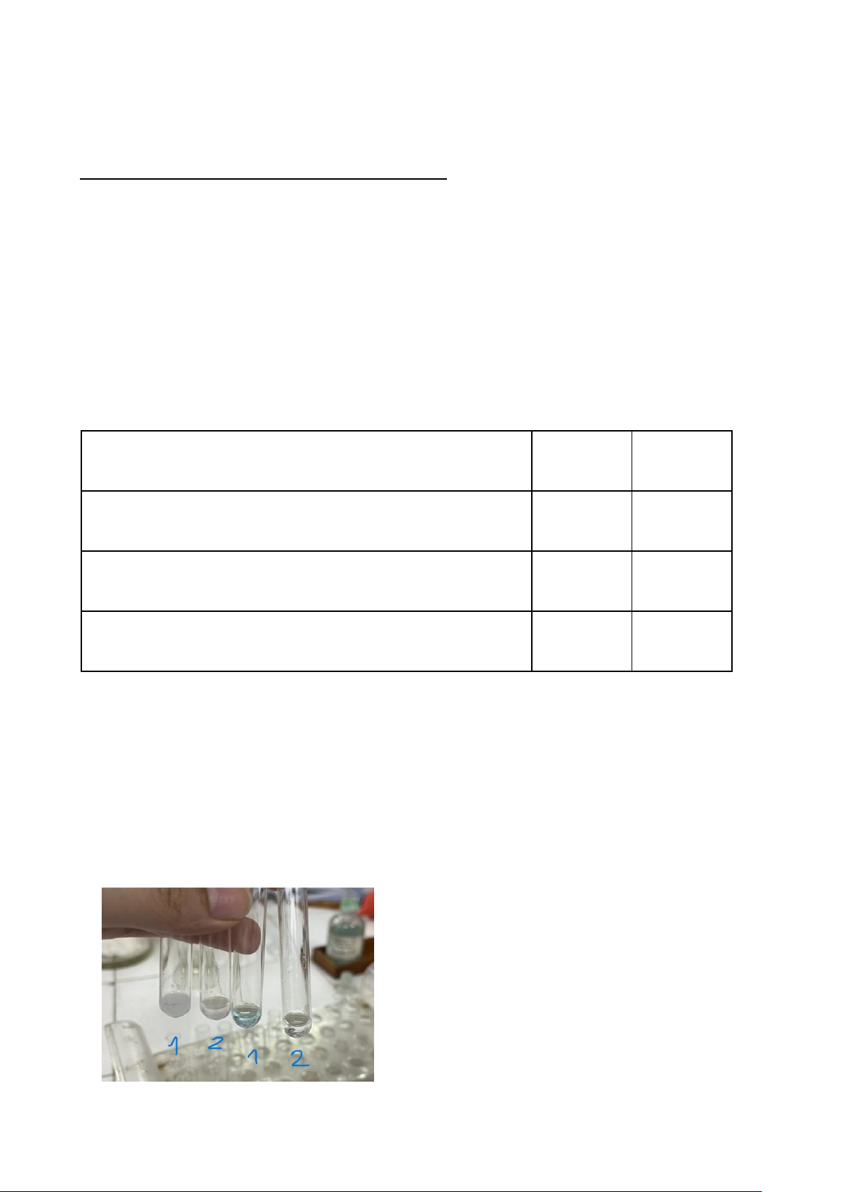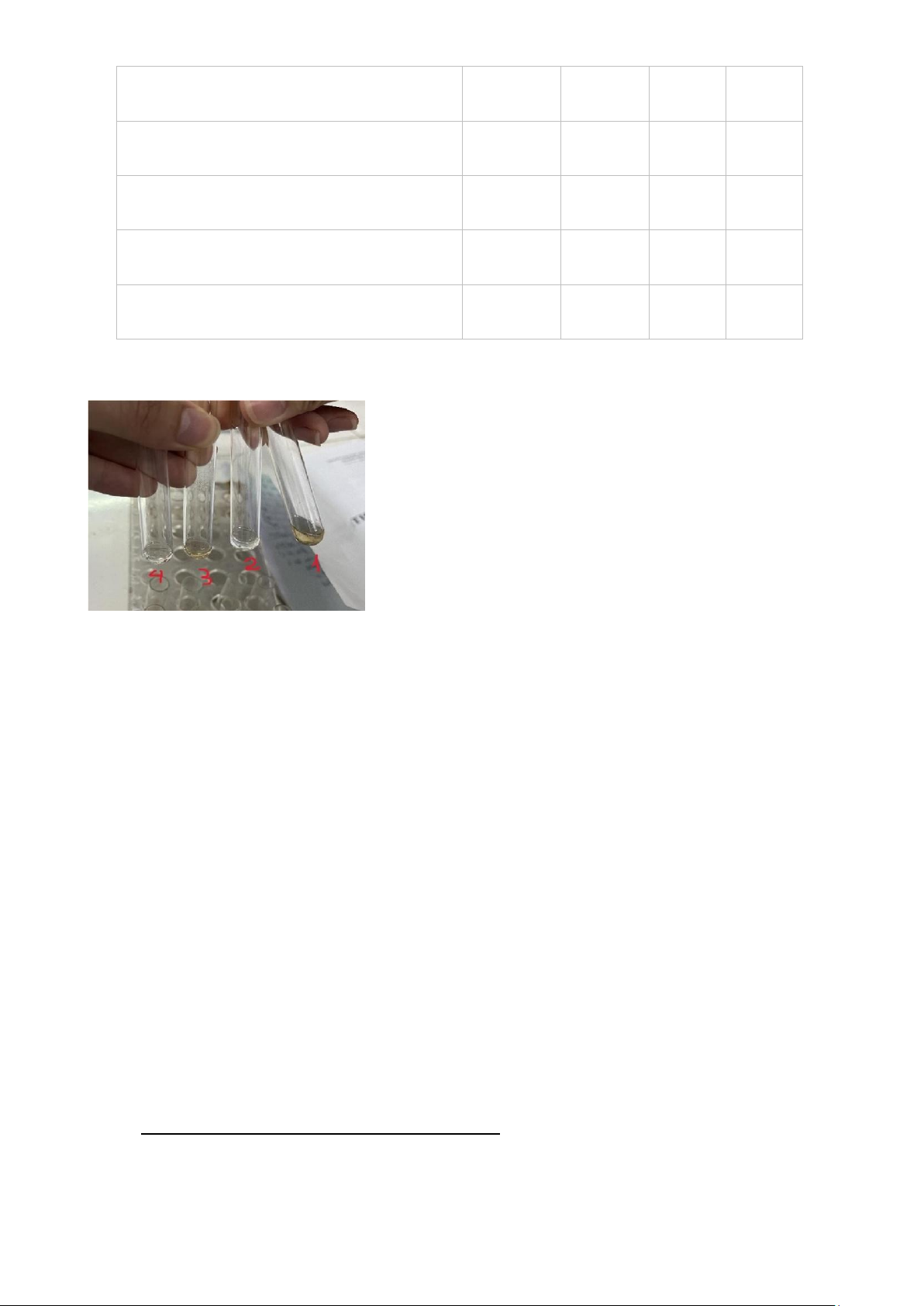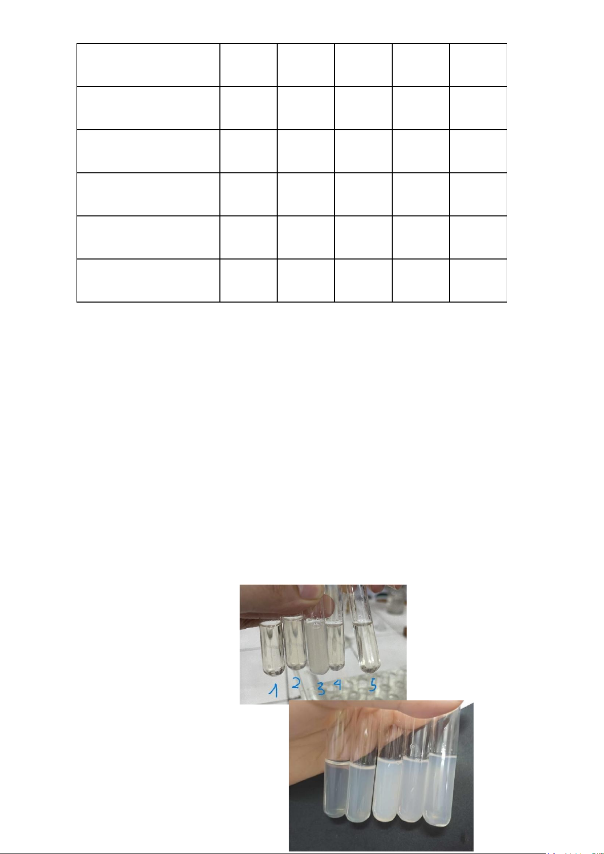 Dung dịch protein trứng 1% (chuẩn bị giống bài 1) Dùng 5 ống nghiệm ghi số: Thuốc thử (mL) 1 2 3 4 5 lOMoAR cPSD| 47205411 Dung dịch đệm pH=3,6 1 pH= 3,8 1 pH=4,75 1 pH=5,6 1 pH=5,8 1 Dung dịch protein trứng 0,5 0,5 0,5 0,5 0,5