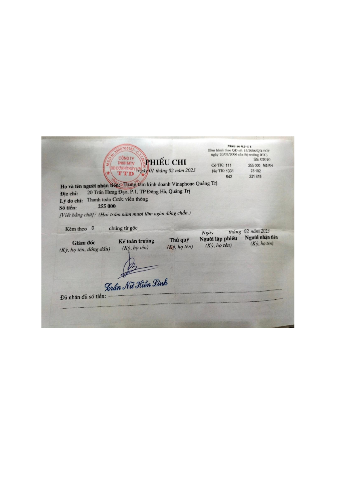 Nghiệp vụ 2: Ngày 01/02/2023 công ty thanh toán bằng tiền mặt cước dịch vụ Viễn
