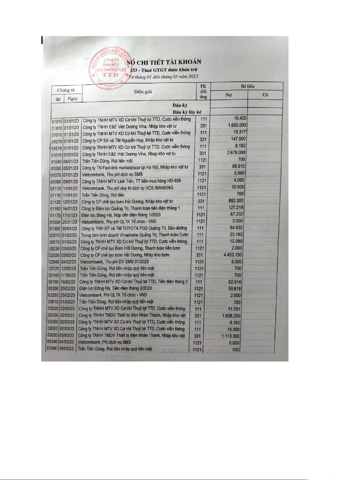 Sổ chi tiết Quý 1 năm 2023 (từ tháng 1 đến tháng 3 năm 2023) được xuất ra file  excel như sau: