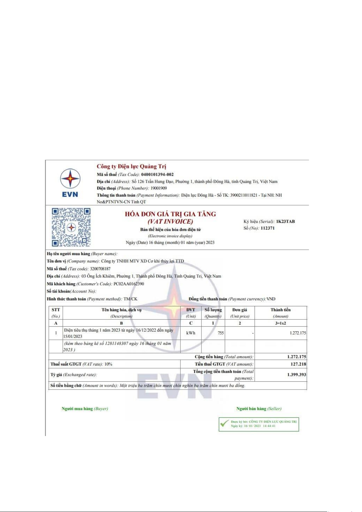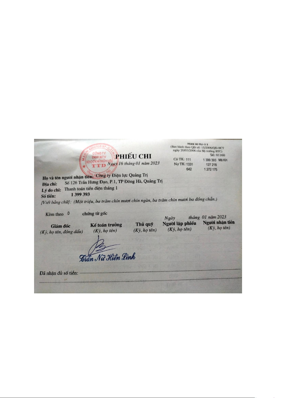 Nghiệp vụ 1: Ngày 16/01.2023 công ty trả tiền điện tháng 1 cho Công ty Điện lực