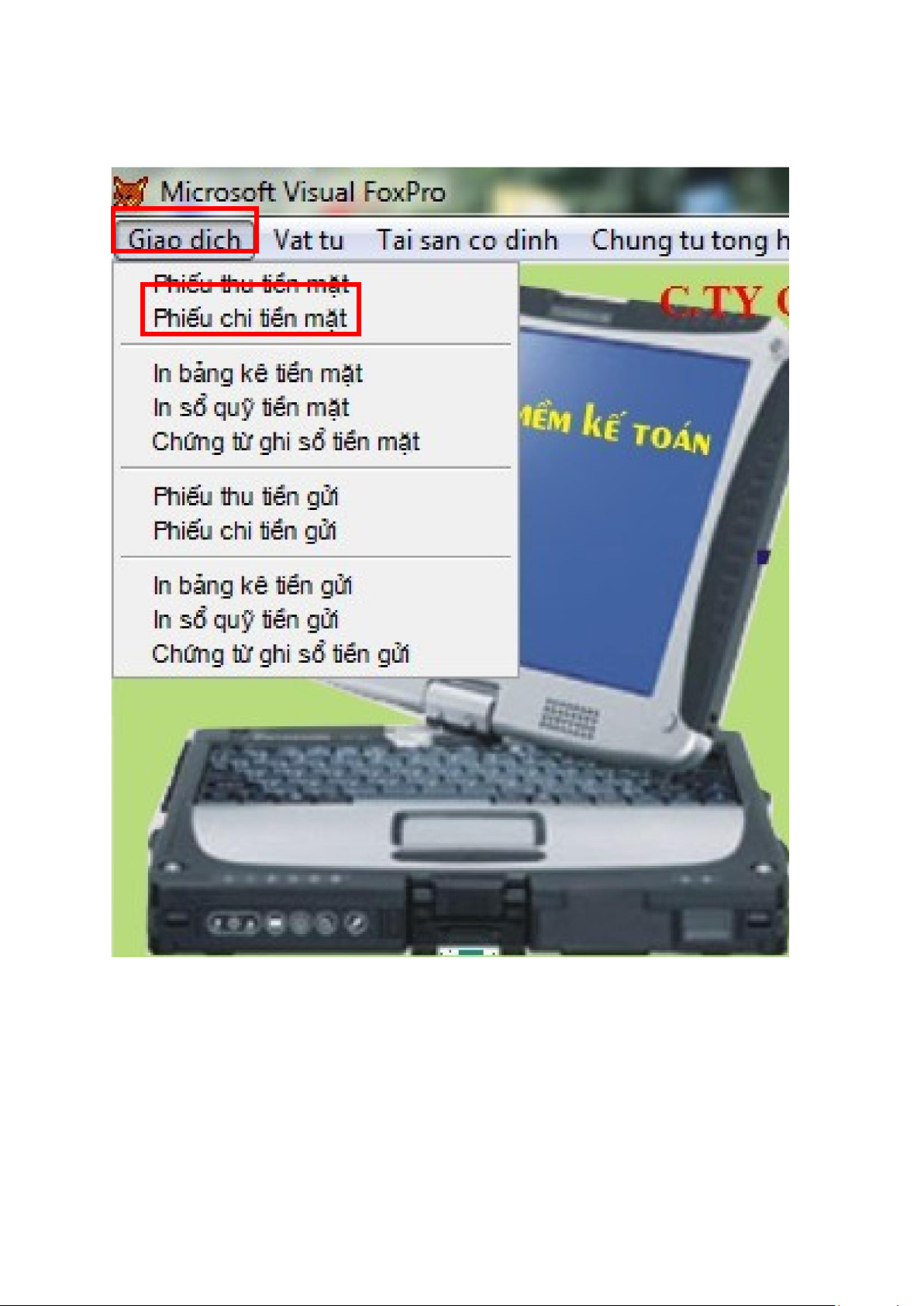 Chọn mục “Giao dịch” -> “Phiếu chi tiền mặt”.        -