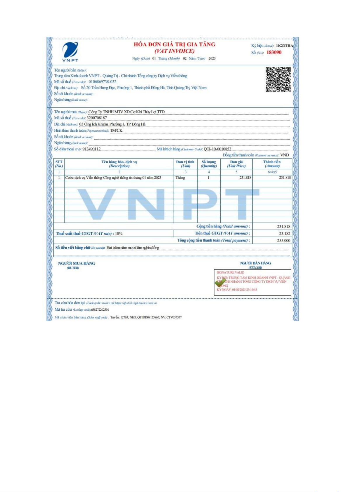 Quảng Trị - Chi nhánh dịch vụ viễn thông. Tổng số tiền là 255.000 đồng, trong đó số