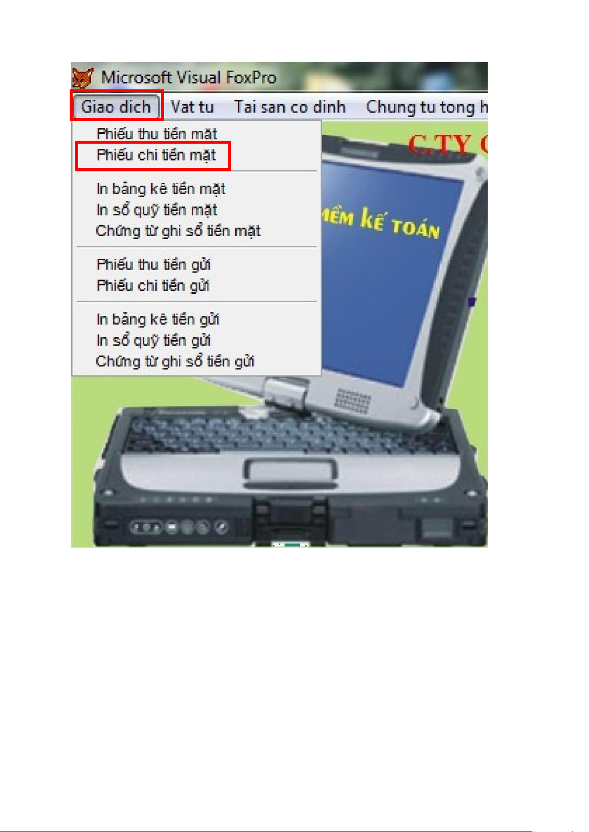 Chọn mục “Giao dịch” -> “Phiếu chi tiền mặt”.    -