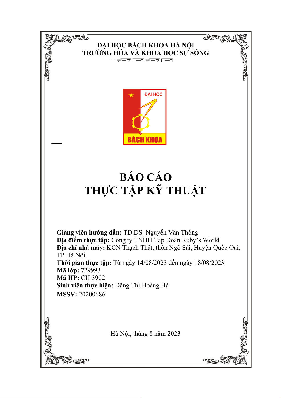 Thời gian thực tập: Từ ngày 14/08/2023 đến ngày 18/08/2023 Mã lớp: 729993 Mã HP: CH 3902