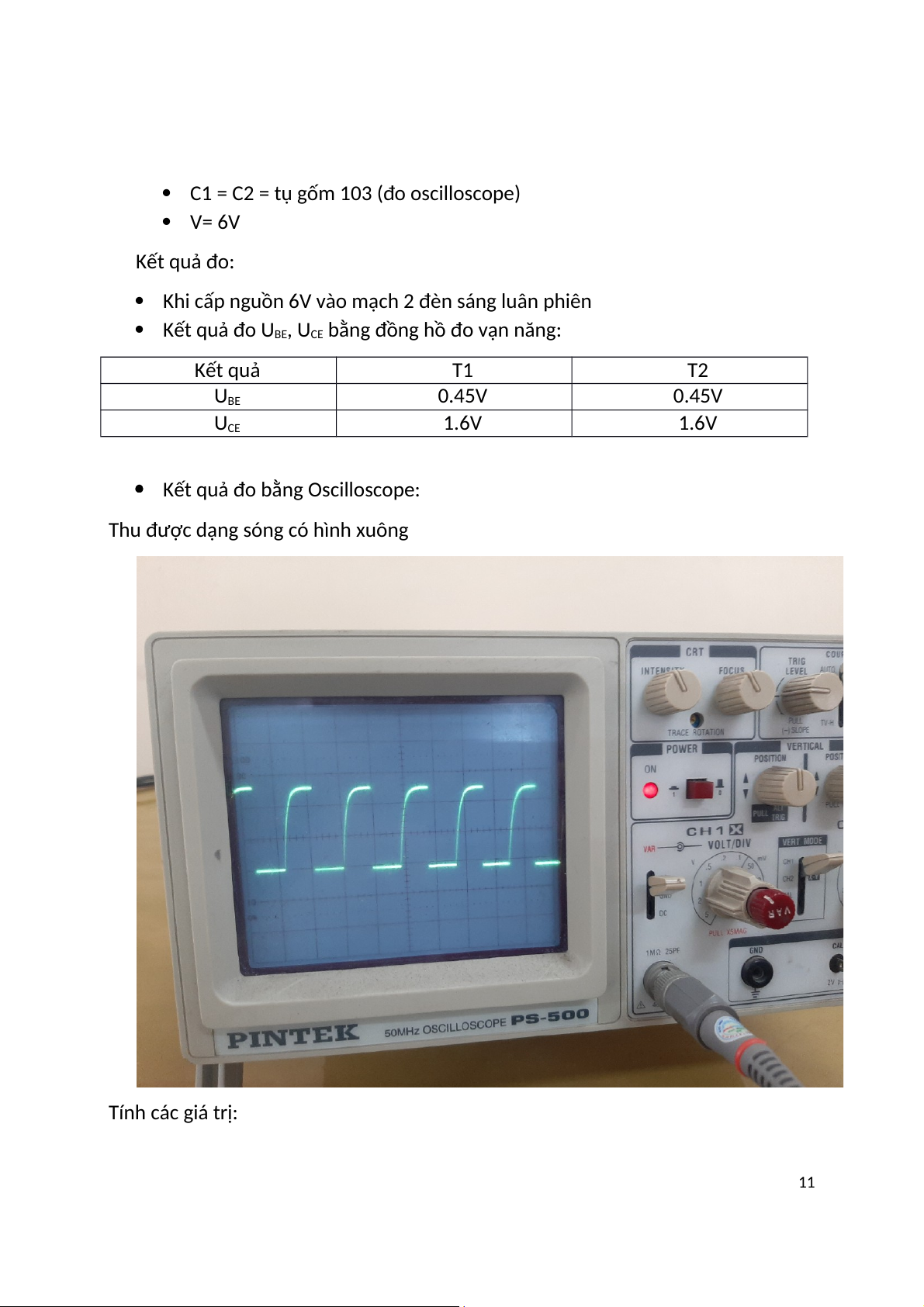 C1 = C2 = tụ gốm 103 (đo oscilloscope) V= 6V Kết quả đo: