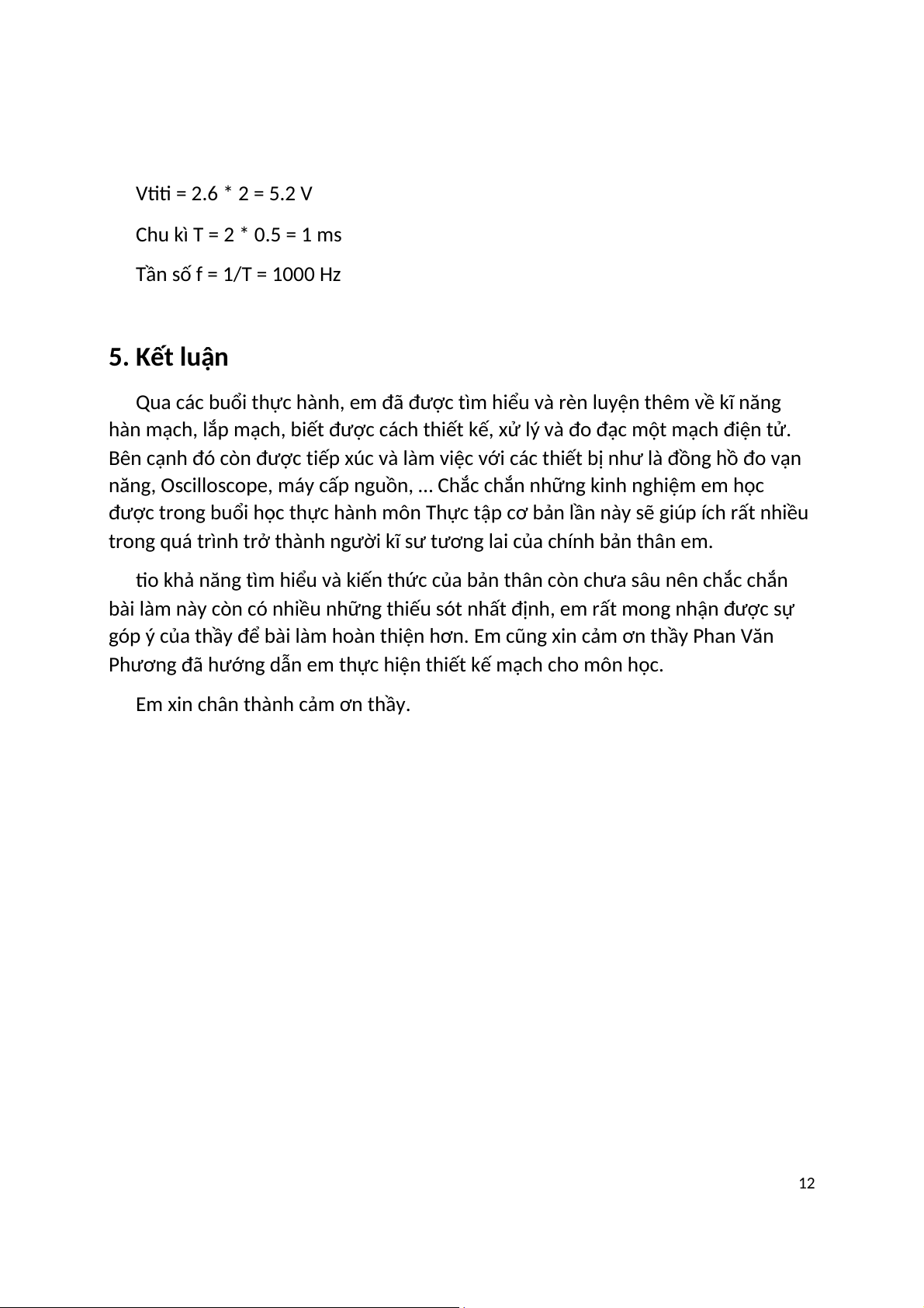 Thu được dạng sóng có hình xuông Tính các giá trị: 11 VDD = 2.6 * 2 = 5.2 V Chu kì T = 2 * 0.5 = 1 ms Tần số f = 1/T = 1000 Hz 5. Kết luận