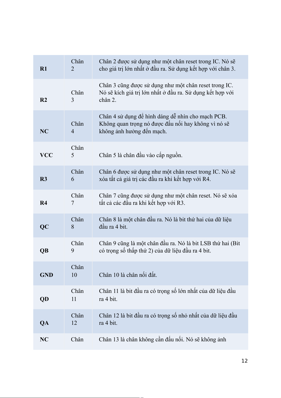 Chân 12 là bit đầu ra có trọng số nhỏ nhất của dữ liệu đầu QA 12 ra 4 bit. NC Chân