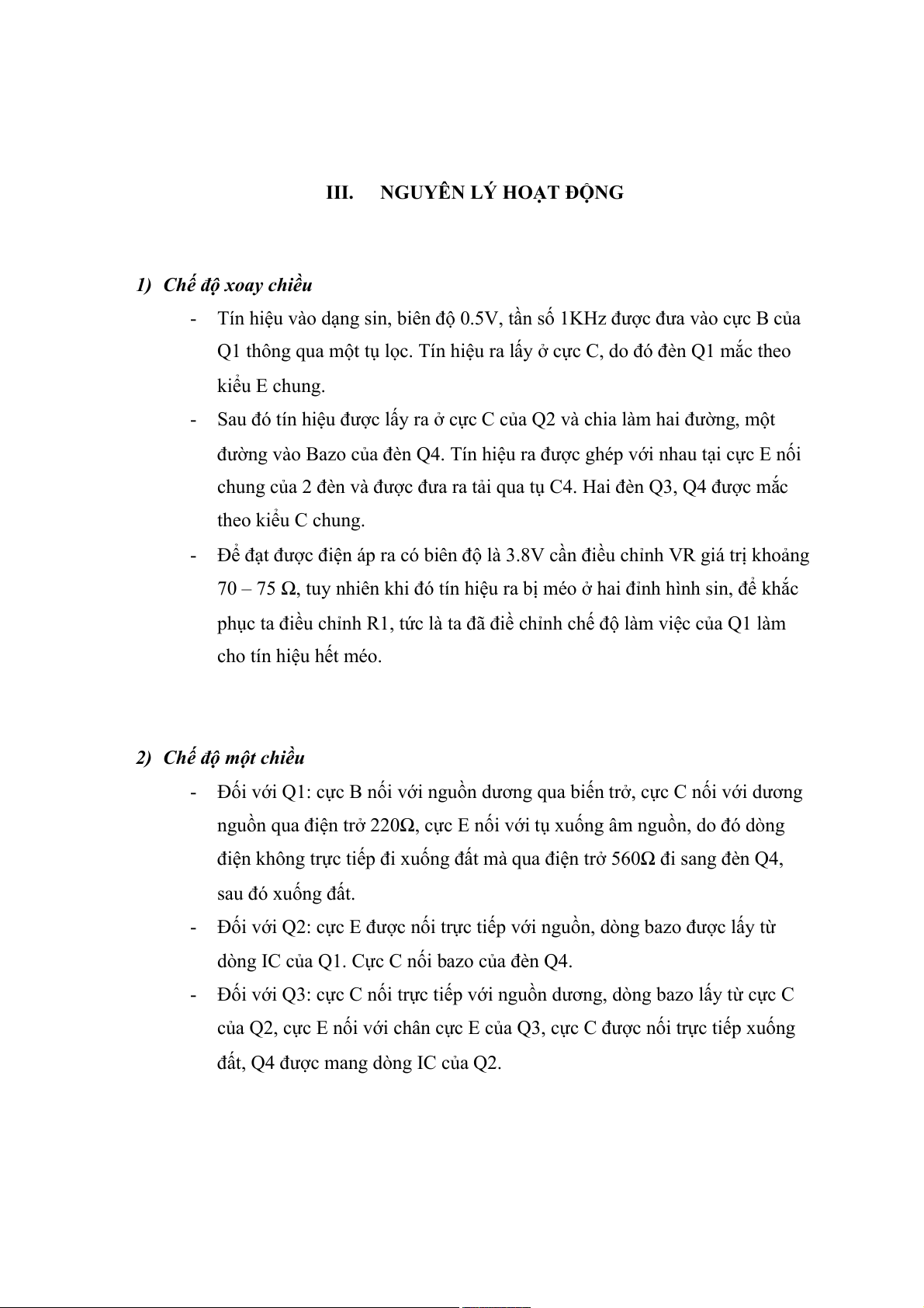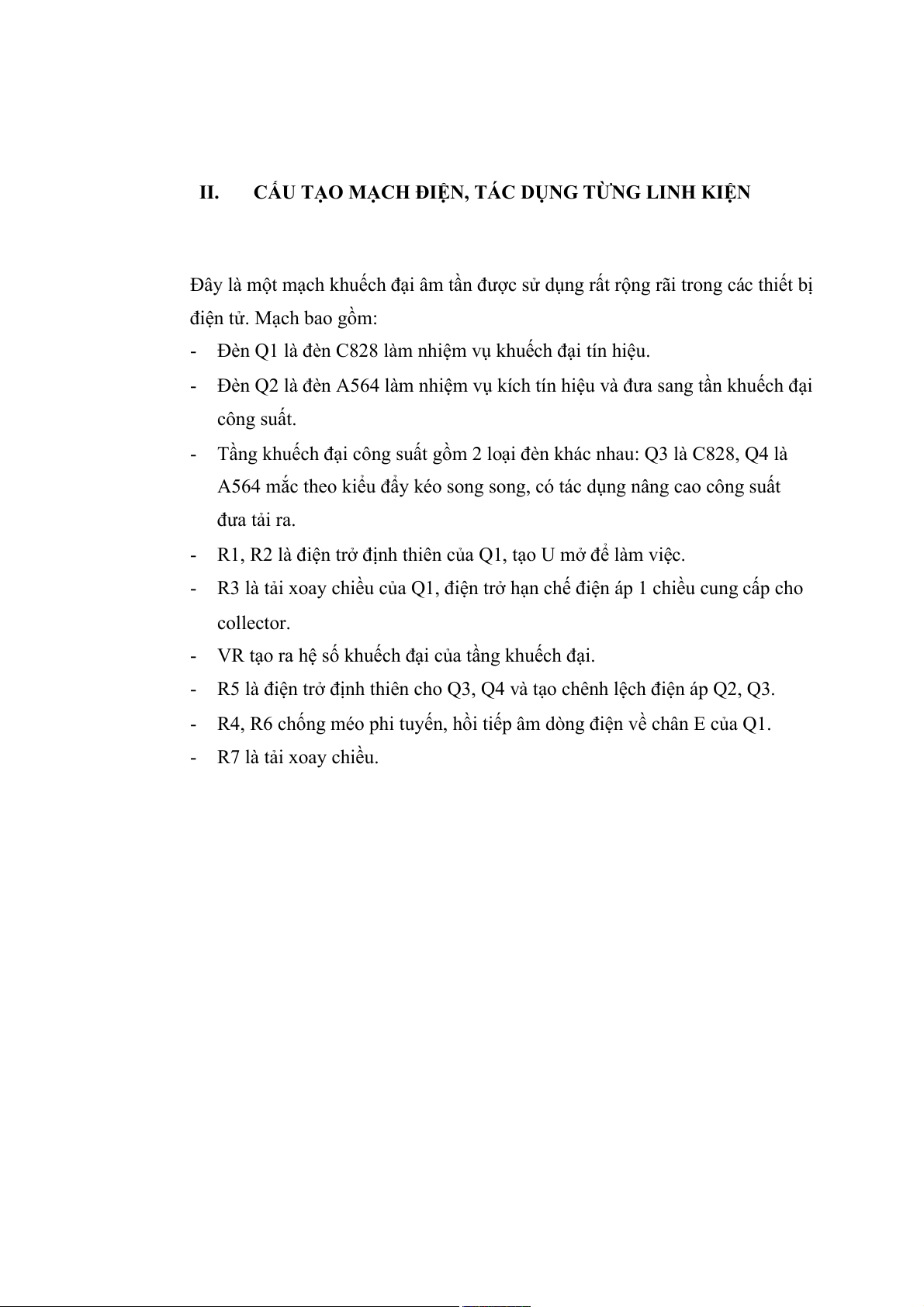 - R4, R6 chống méo phi tuyến, hồi tiếp âm dòng điện về chân E của Q1. - R7 là tải xoay chiều. III.