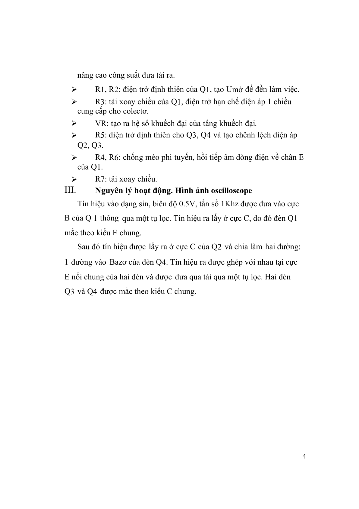 R4, R6: chống méo phi tuyến, hồi tiếp âm dòng điện về chân E của Q . 1 ➢ R7: tải xoay chiều. III.