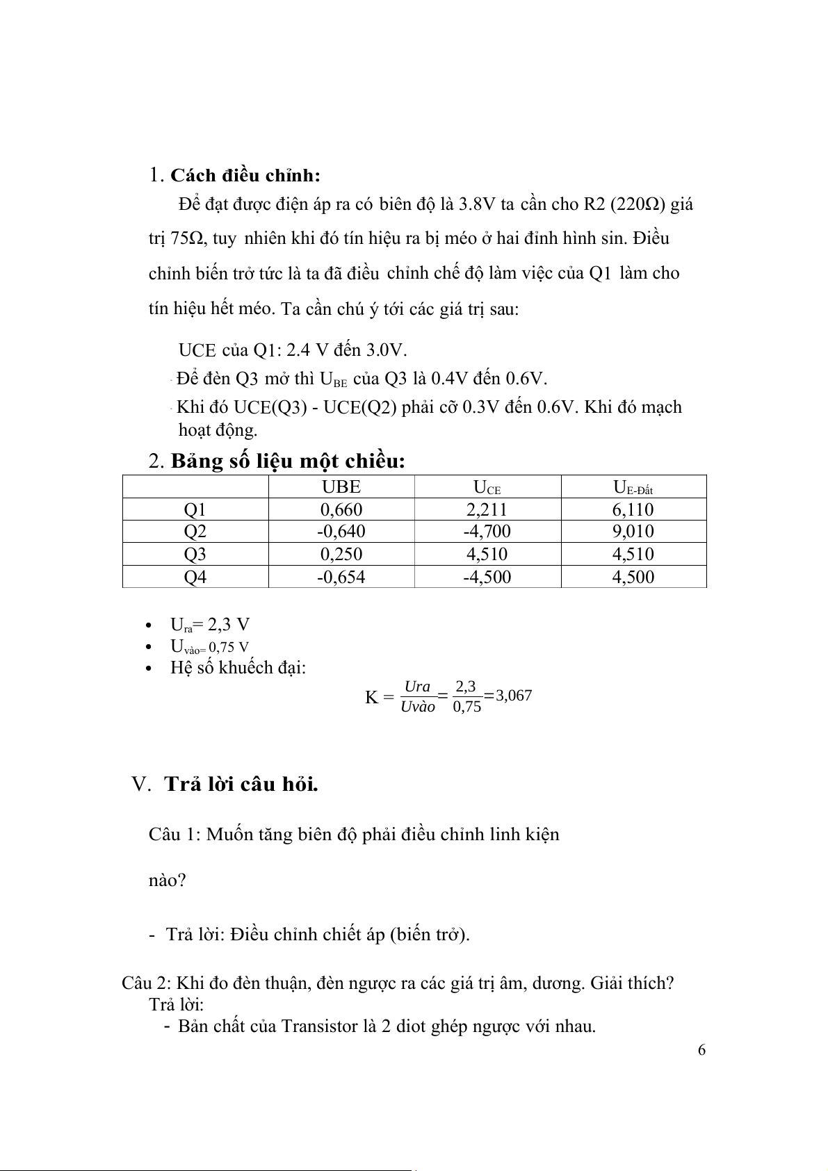 2. Bảng số liệu một chiều: UBE UCE UE-Đất Q1 0,660 2,211 6,110 Q2 -0,640 -4,700 9,010 Q3 0,250 4,510 4,510 Q4 -0,654 -4,500 4,500 Ura= 2,3 V Uvào= 0,75 V Hệ số khuếch đại: Ura K = 2,3 = =3,067 Uvào 0,75