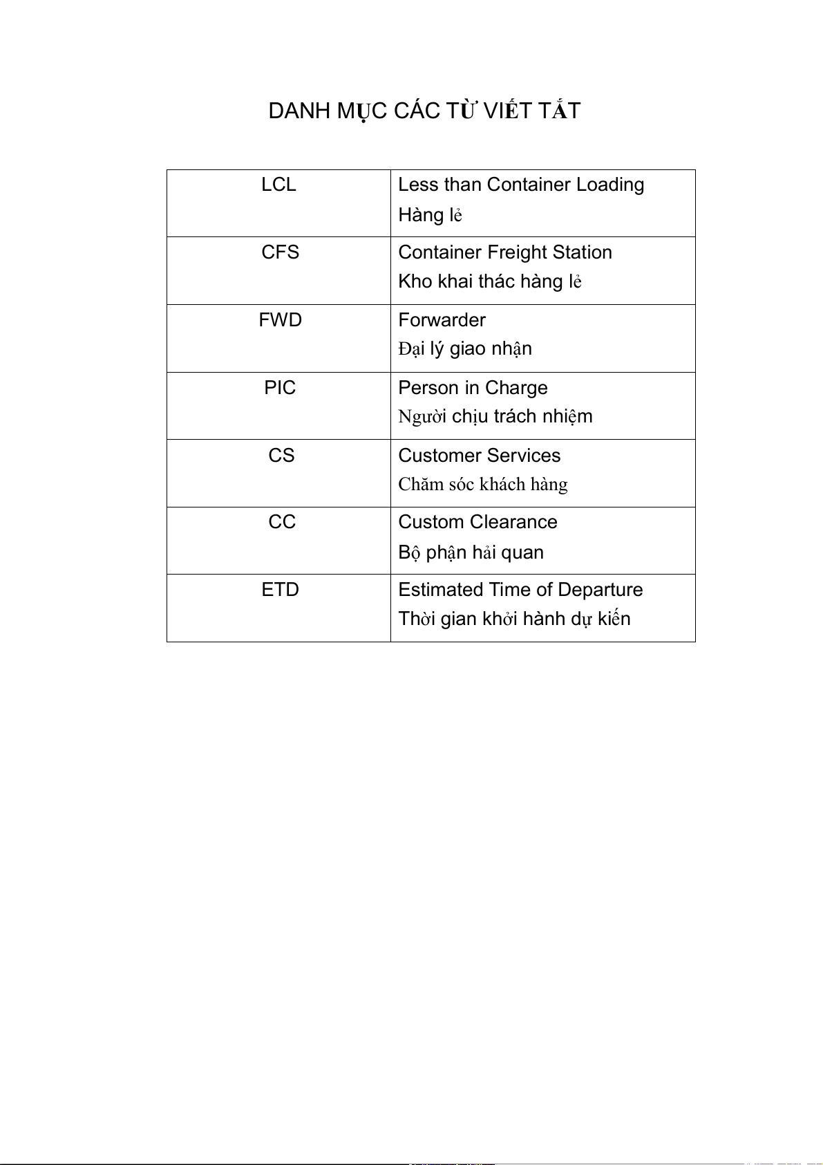 DANH MỤC CÁC TỪ VIẾT TẮT LCL Less than Container Loading Hàng lẻ CFS Container Freight Station Kho khai thác hàng lẻ FWD Forwarder Đại lý giao nhận PIC Person in Charge