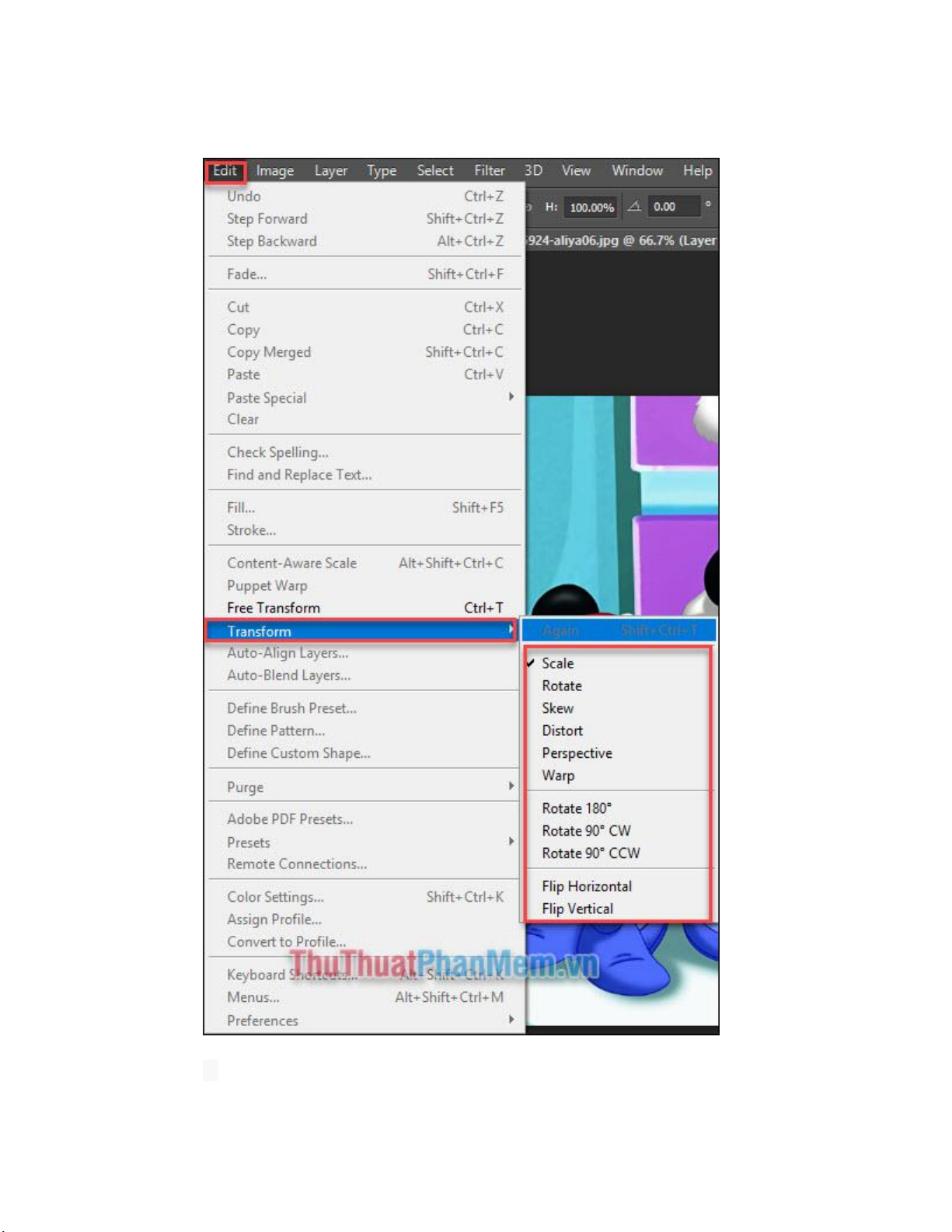 - Bước 4: Thay đổi kích thước hay lật đối tượng bằng cách chọn Edit >> Transform.