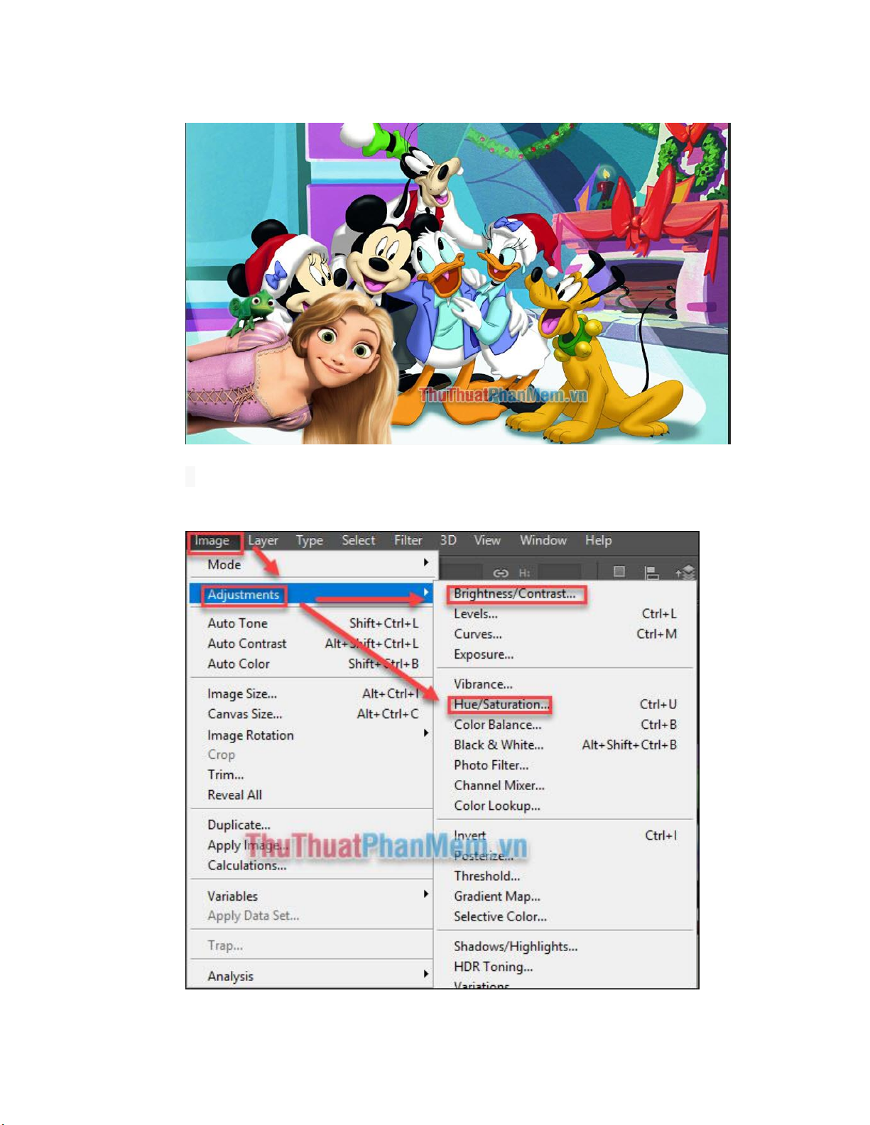 Brightness/Contract… và Hue/Saturation… Hãy tùy chỉnh thật cẩn thận bước này
