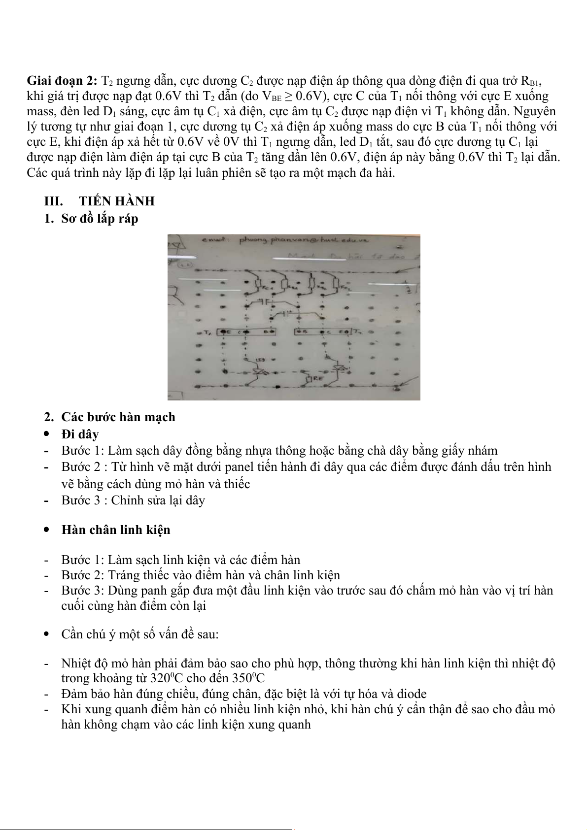 Các quá trình này lặp đi lặp lại luân phiên sẽ tạo ra một mạch đa hài. III. TIẾN HÀNH 1. Sơ đồ lắp ráp 2. Các bước hàn mạch Đi dây