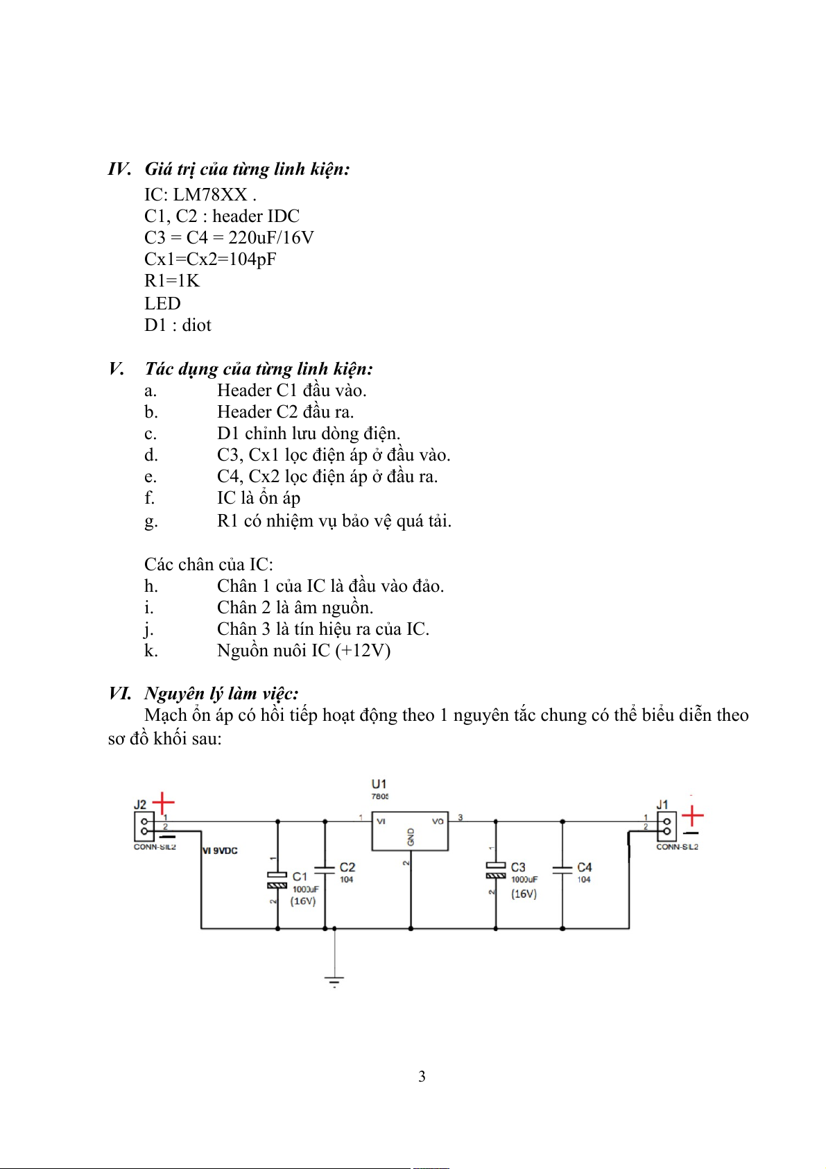V. Tác dụng của từng linh kiện: a. Header C1 đầu vào. b. Header C2 đầu ra. c. D1 chỉnh lưu dòng điện. d.