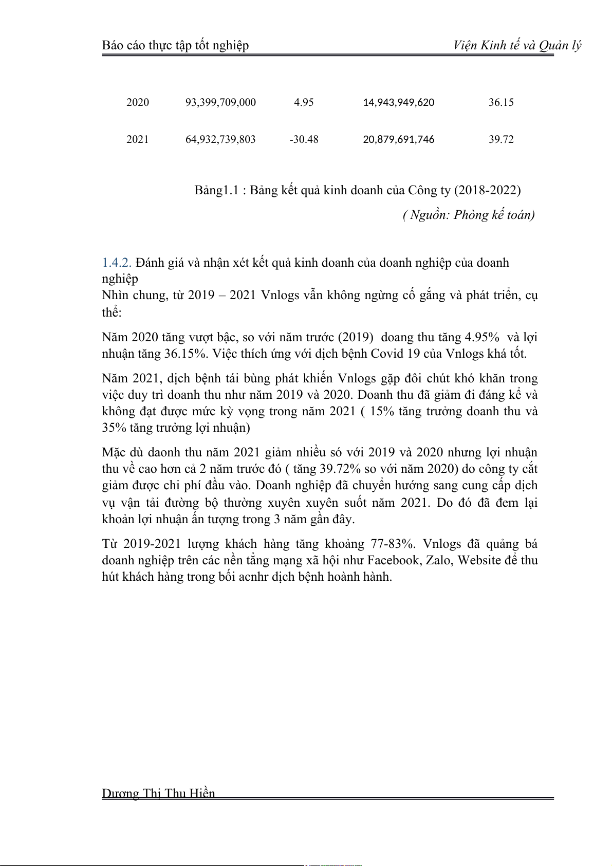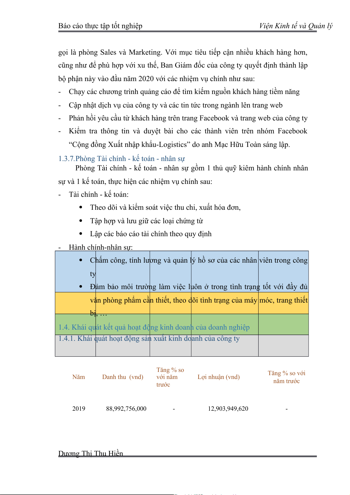 1.4.1. Khái quát hoạt động sản xuất kinh doanh của công ty Tăng % so Tăng % so với Năm Danh thu (vnd) với năm Lợi nhuận (vnd) trước năm trước 2019 88,992,756,000 - 12,903,949,620 - Dương Thị Thu Hiền