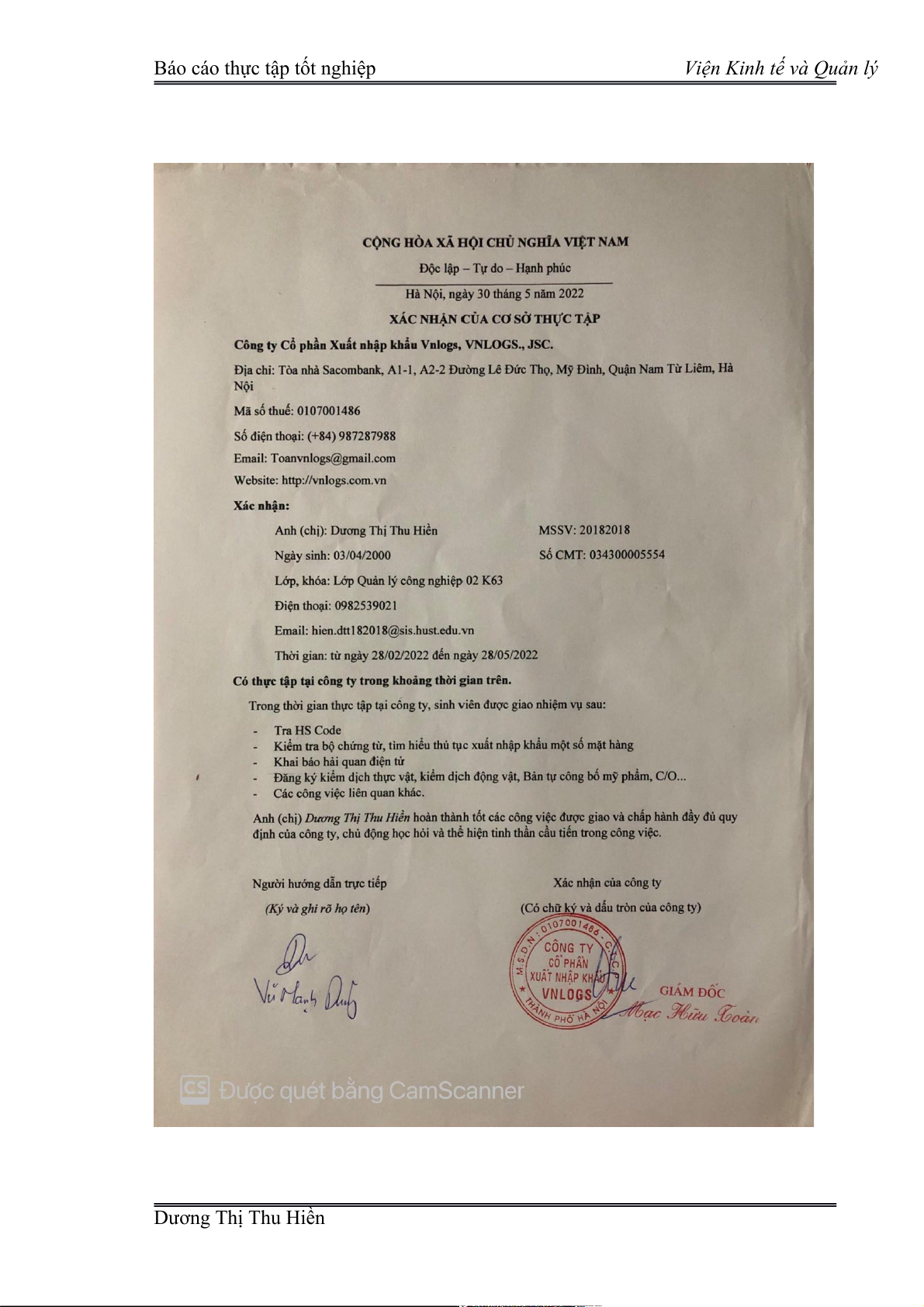Hà Nội, ngày 15 tháng 5 năm 2022 Sinh viên thực hiện Dương Thị Thu Hiền Dương Thị Thu Hiền
