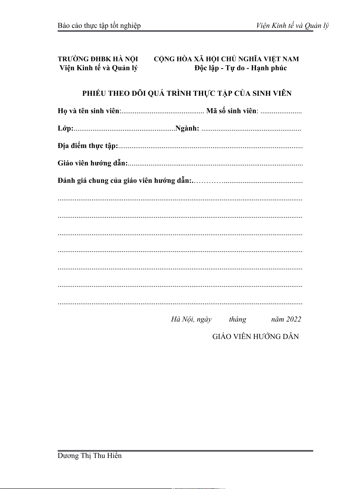 Hà Nội, ngày tháng năm 2022 GIÁO VIÊN HƯỚNG DẪN Dương Thị Thu Hiền